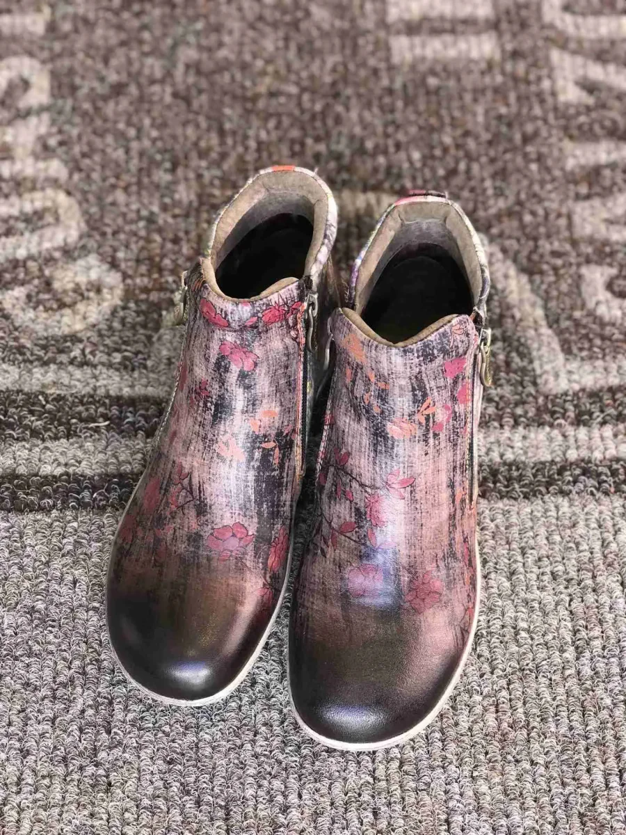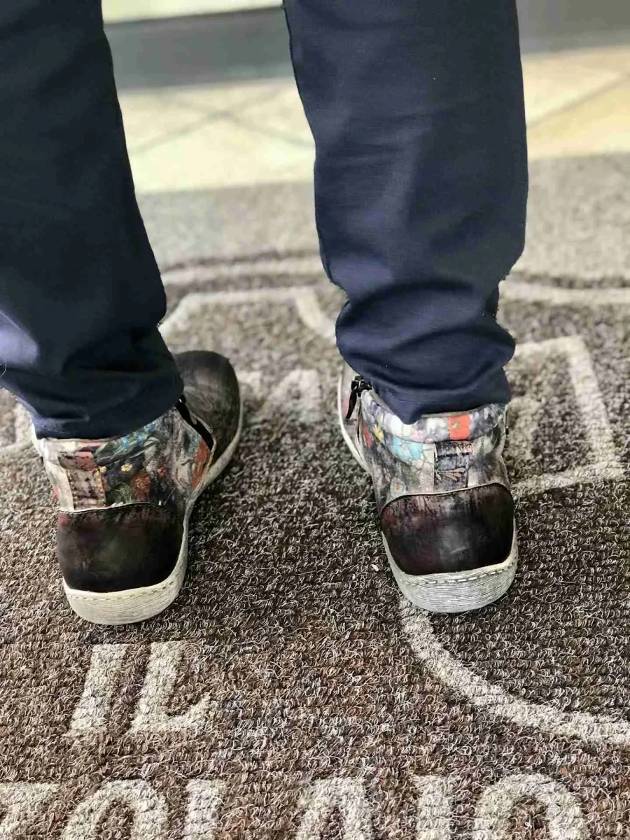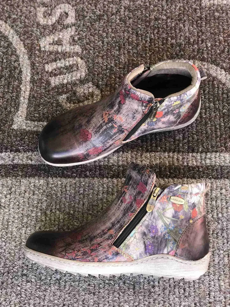 Stivaletto in pelle stampata a fiori multicolori su fondo texture graffiti grigio perla, sperone tinta unita nera, puntale brush oil nero. Ha due zip per essere calzata agilmente. Fodere di pelle e suola di gomma grigia. Una furba imbottitura nel perimetro della caviglia assicura comfort.