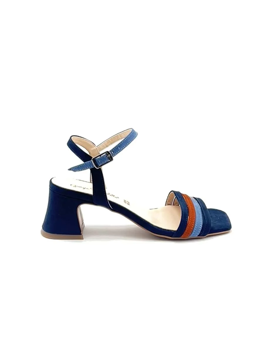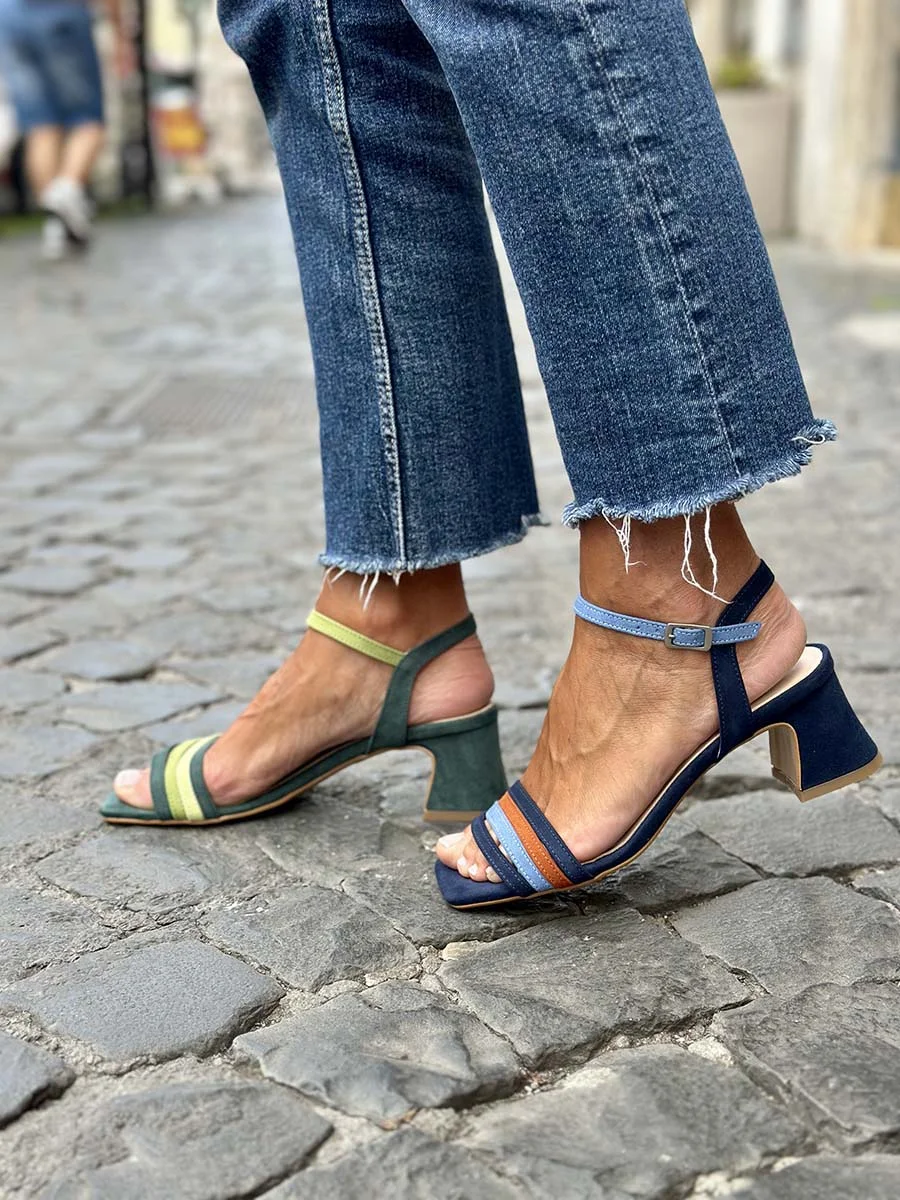 Si chiama “Lidia” il nuovo sandalo di questa stagione, dalla forma squadrata realizzato in morbido camoscio blu navy, sottile cinturino regolabile alla caviglia e profili a contrasto cielo e mattone. Tacco cm 5, il fondo è in cuoio.