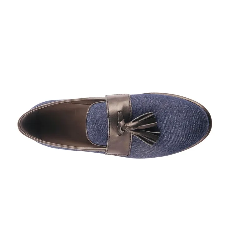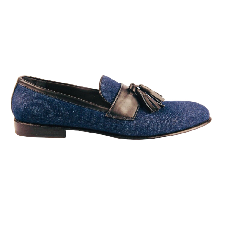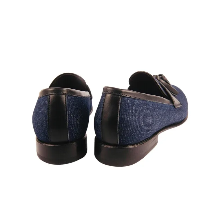 La loafer mocassino uomo Beppe – art.7006 è’ un mocassino realizzato in vitello Denim Blue e riporti e nappine in vitello nero.