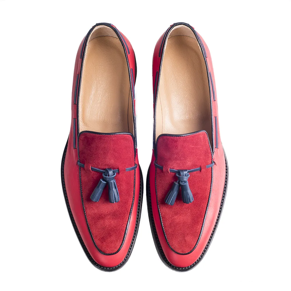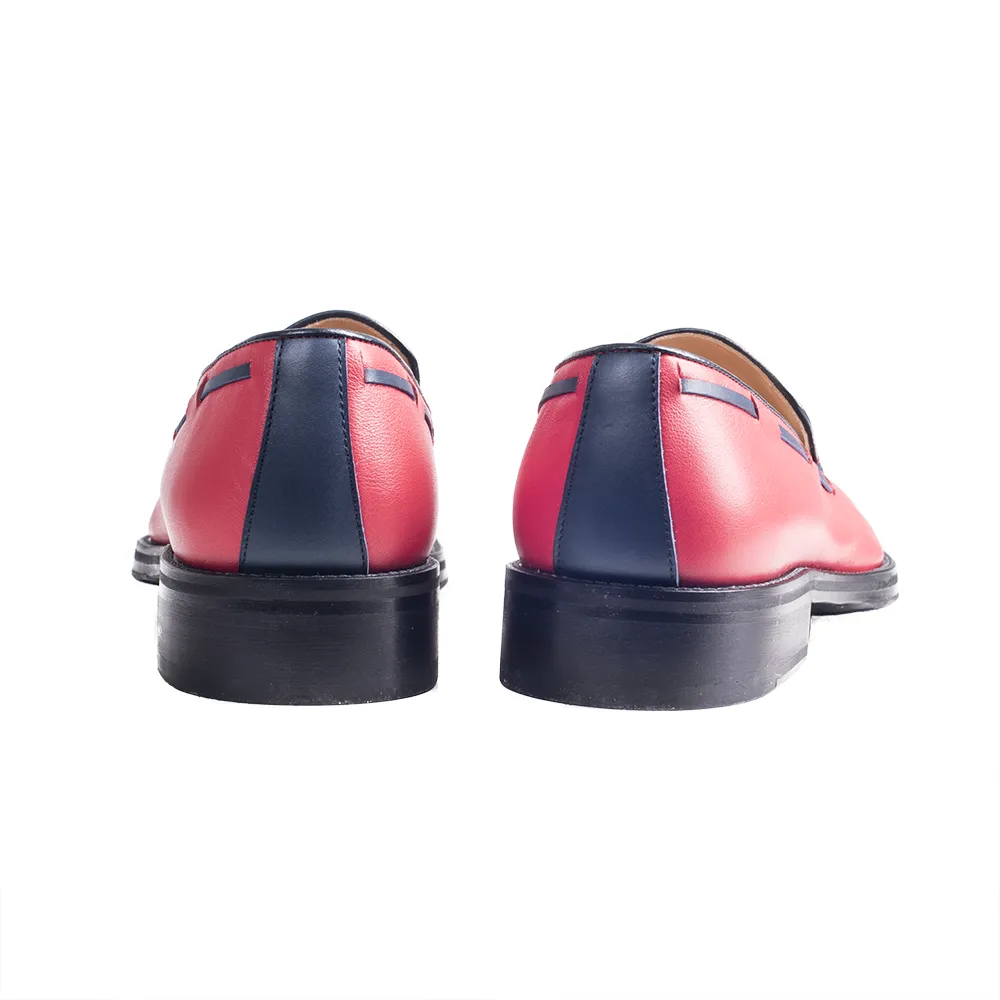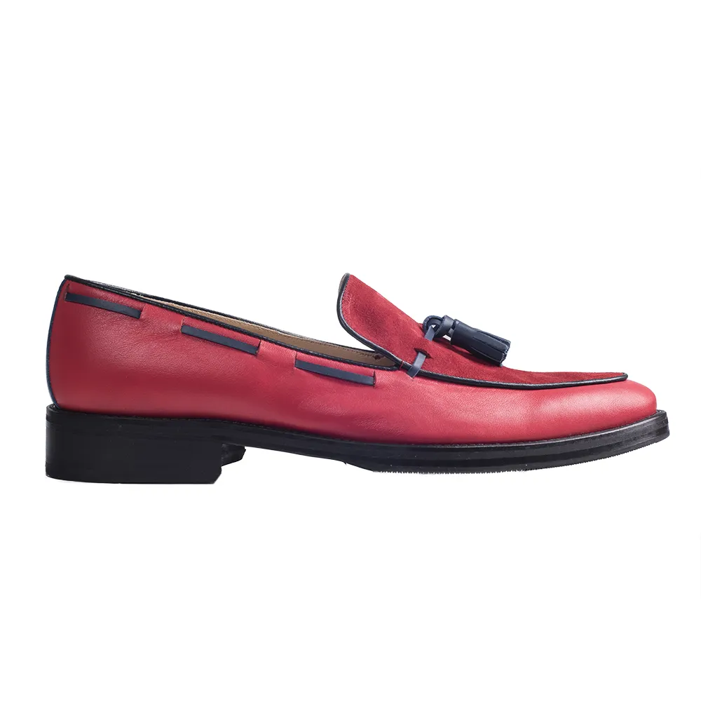 La loafer uomo maratea – art.8611 è un mocassino loafer in vitello rosso,camoscio rosso e riporti blu avio