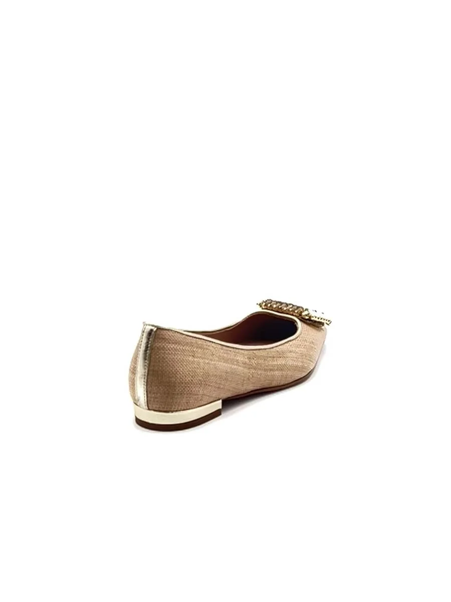 Si chiama “Marcella” la nuova ballerina di questa stagione, dalla forma a punta, con tomaia realizzata in rafia beige e accessorio in “Swarovski”. Tacco cm 1. Il fondo è in cuoio.