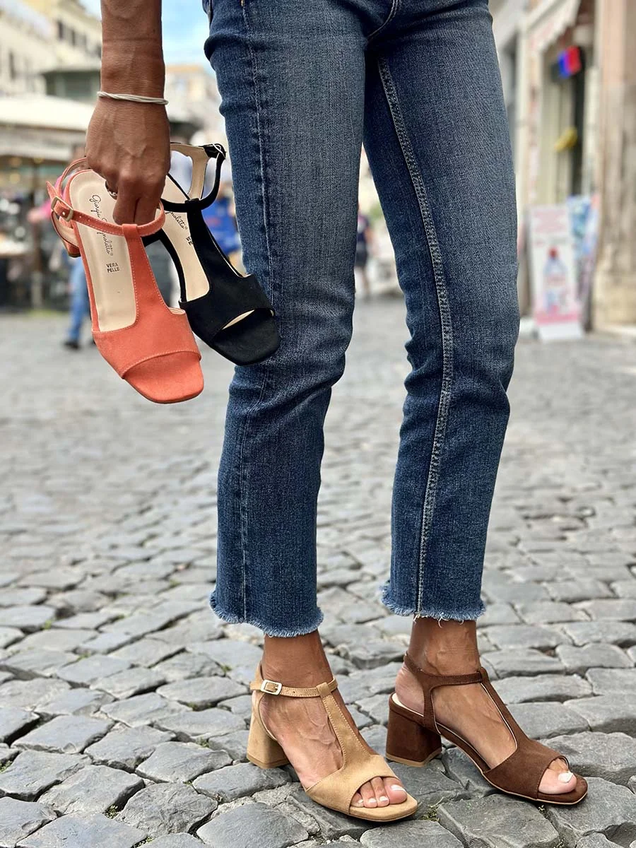 Si chiama “Mary” il nuovo sandalo di questa stagione dalla forma squadrata realizzato in morbido camoscio nero e sottile cinturino a “T-bar” regolabile alla caviglia. Tacco cm 5, il fondo è in cuoio.