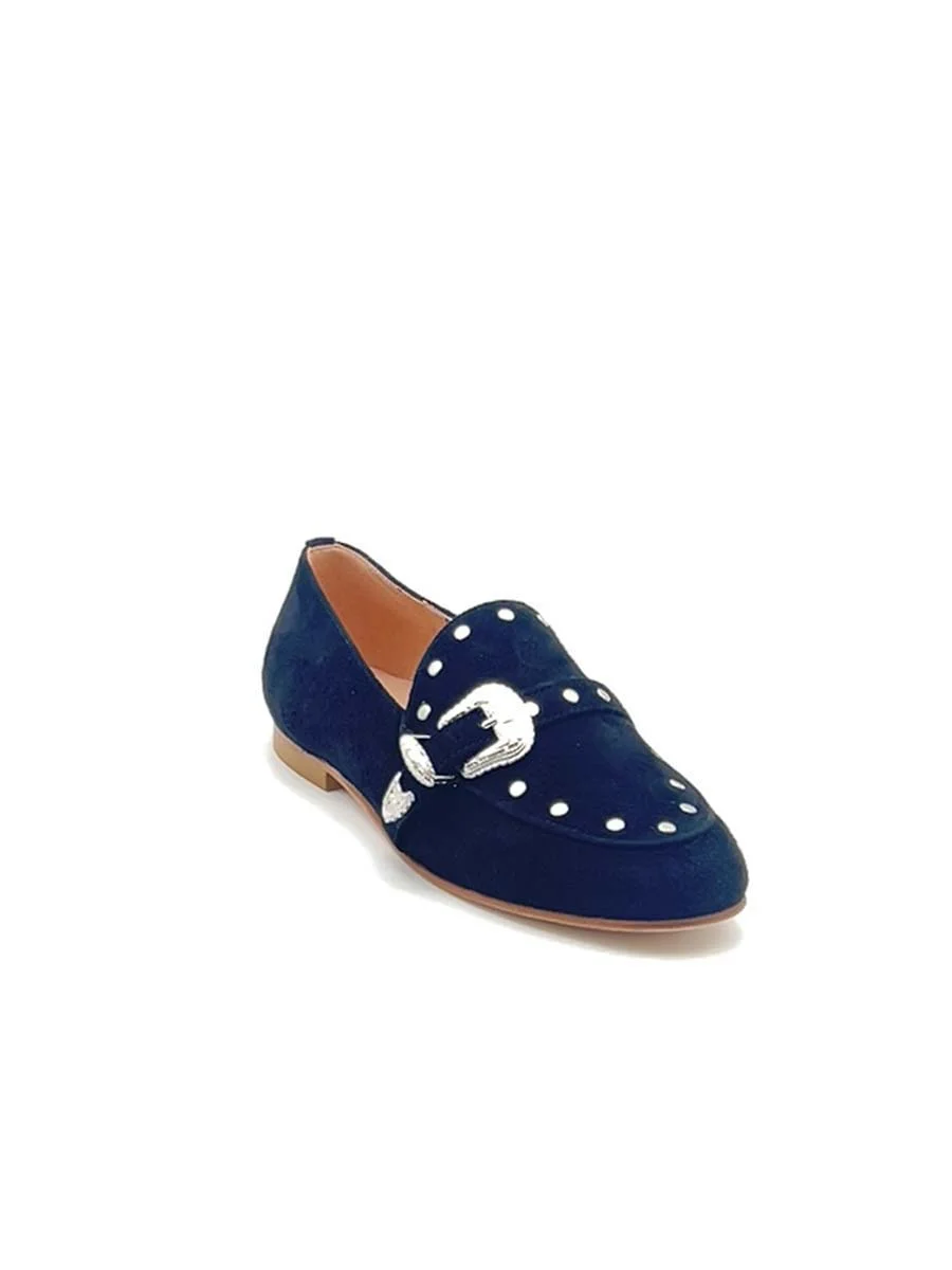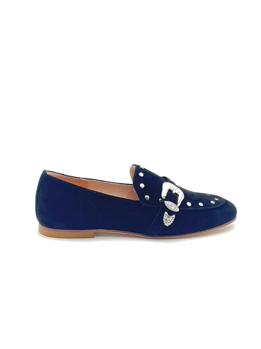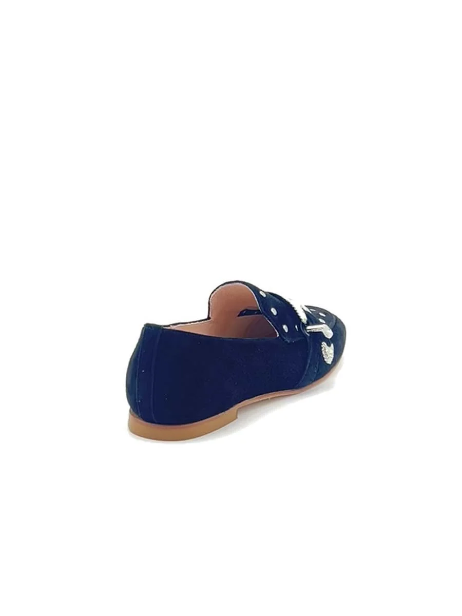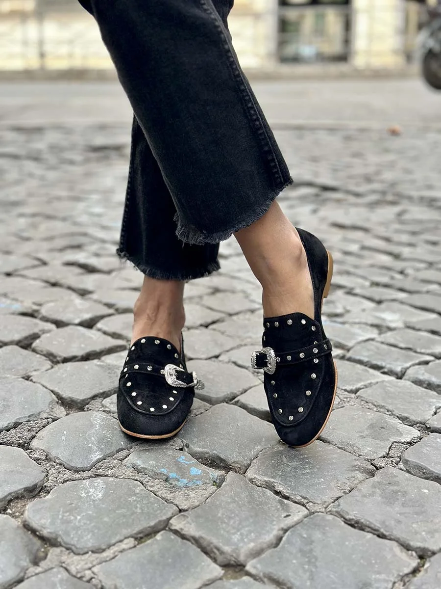 Si chiama “Matilde” il nuovo mocassino di questa stagione, dalla forma a mandorla, realizzato in morbido camoscio nero, con borchie e fibbia cowboy argento. Tacco cm 1, il fondo è in gomma.