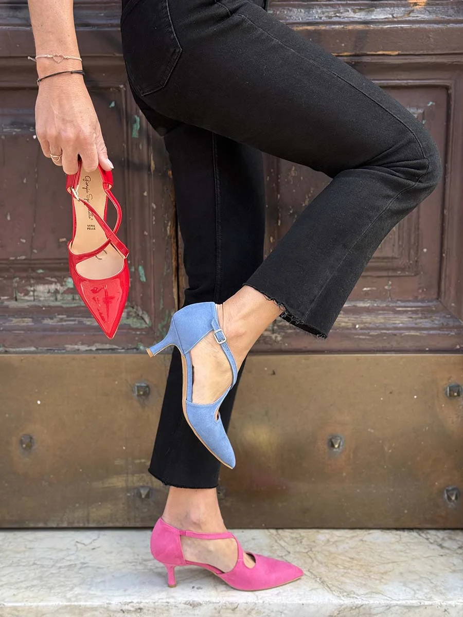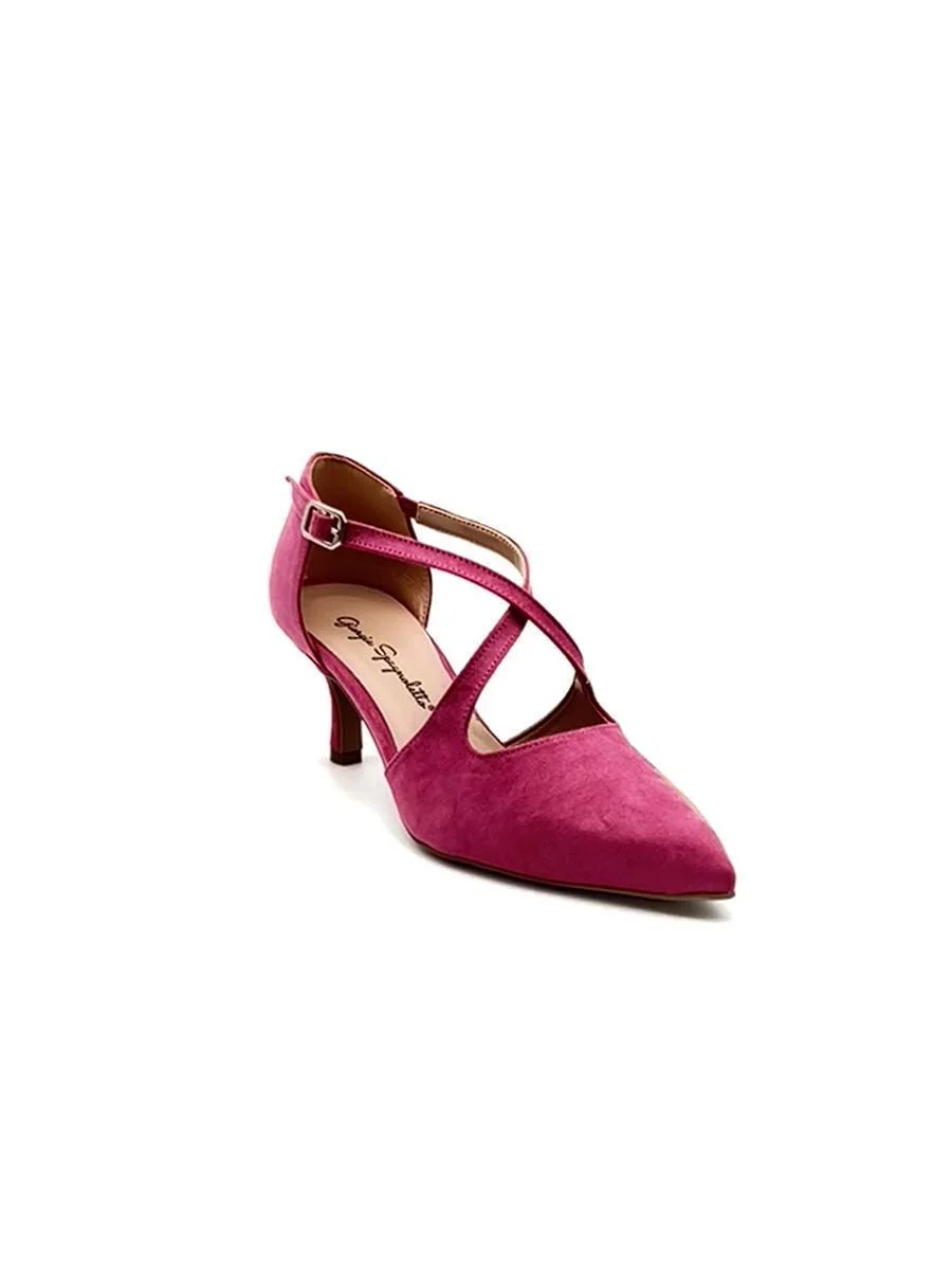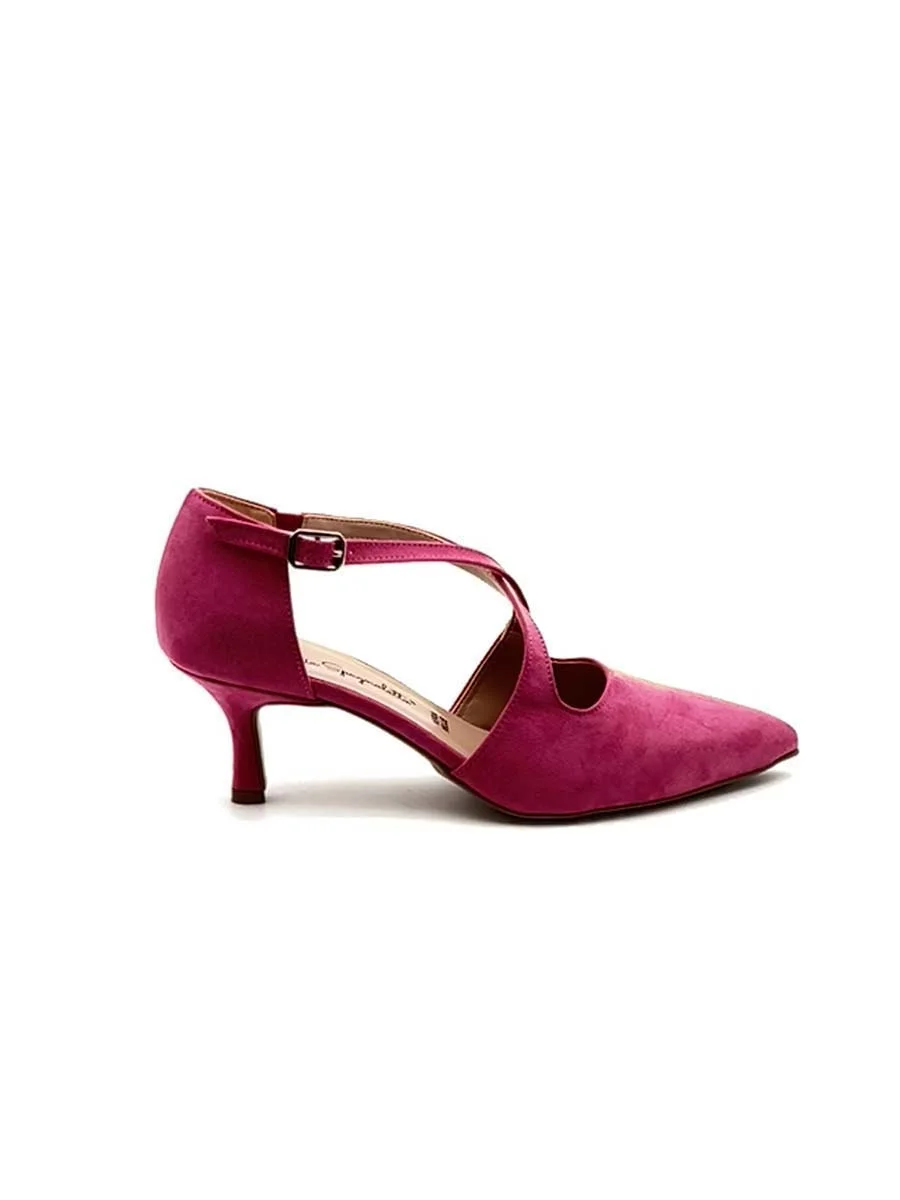 Si chiama “Melanie” il nuovo Decollete di questa stagione dalla forma a punta realizzato in morbido camoscio fucsia, con sottile cinturino a incrocio regolabile alla caviglia. Tacco a rocchetto cm 5, il fondo è in cuoio.