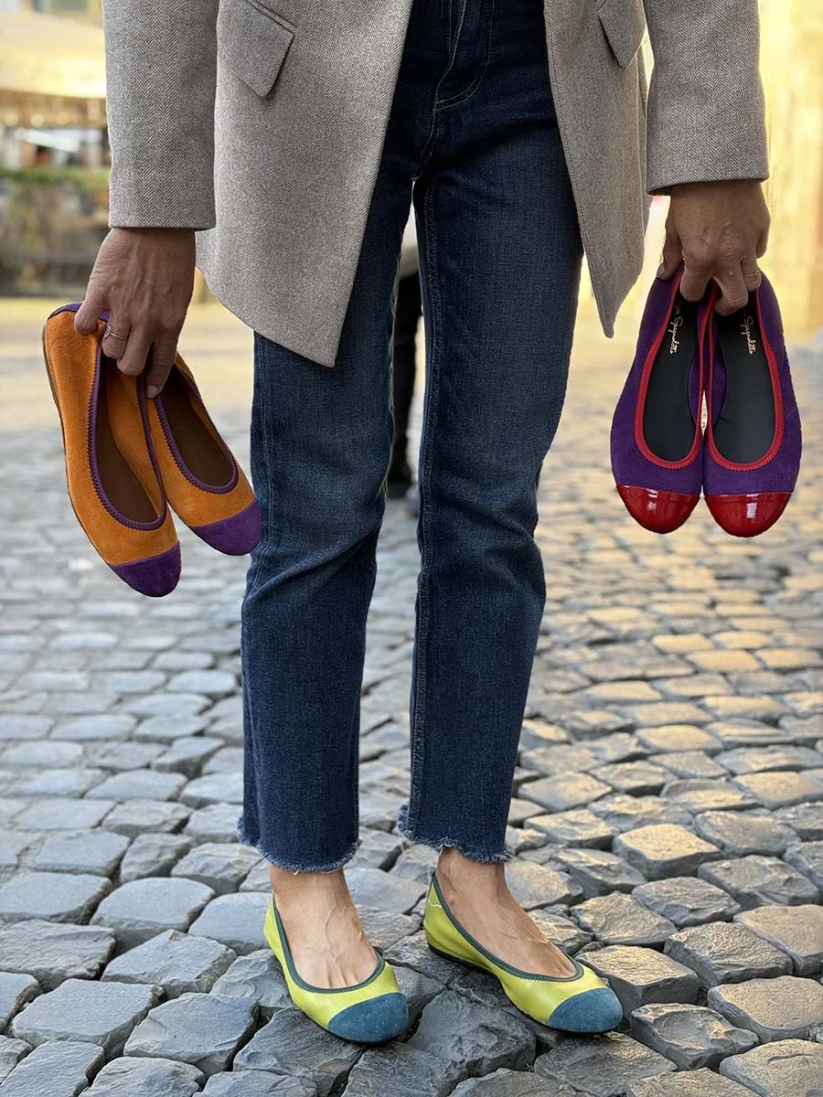 Si chiama “Minnie” la nostra ballerina con rialzo interno anti tallonite di 1,5 cm. Realizzata in morbido camoscio arancio con punta a contrasto viola. Il fondo è in gomma. Si consiglia una taglia in più.