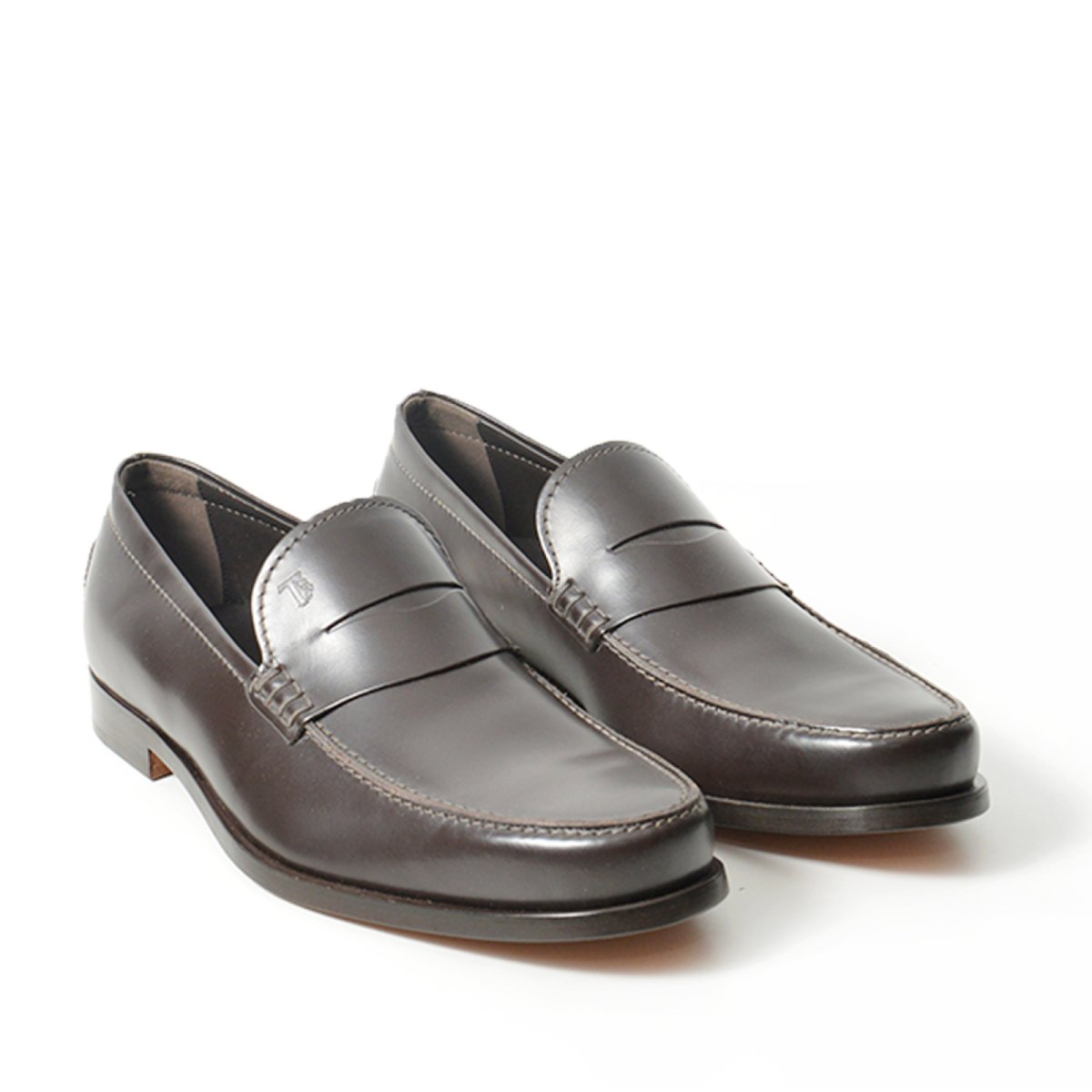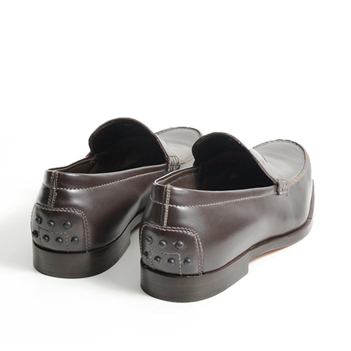 Mocassino in pelle marrone e mascherina. Suola in cuoio e tipici bollini in gomma sullo sperone. Calzata regolare.