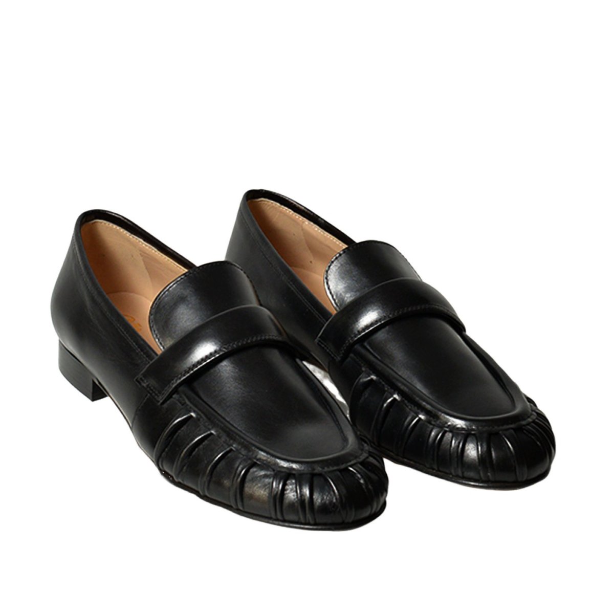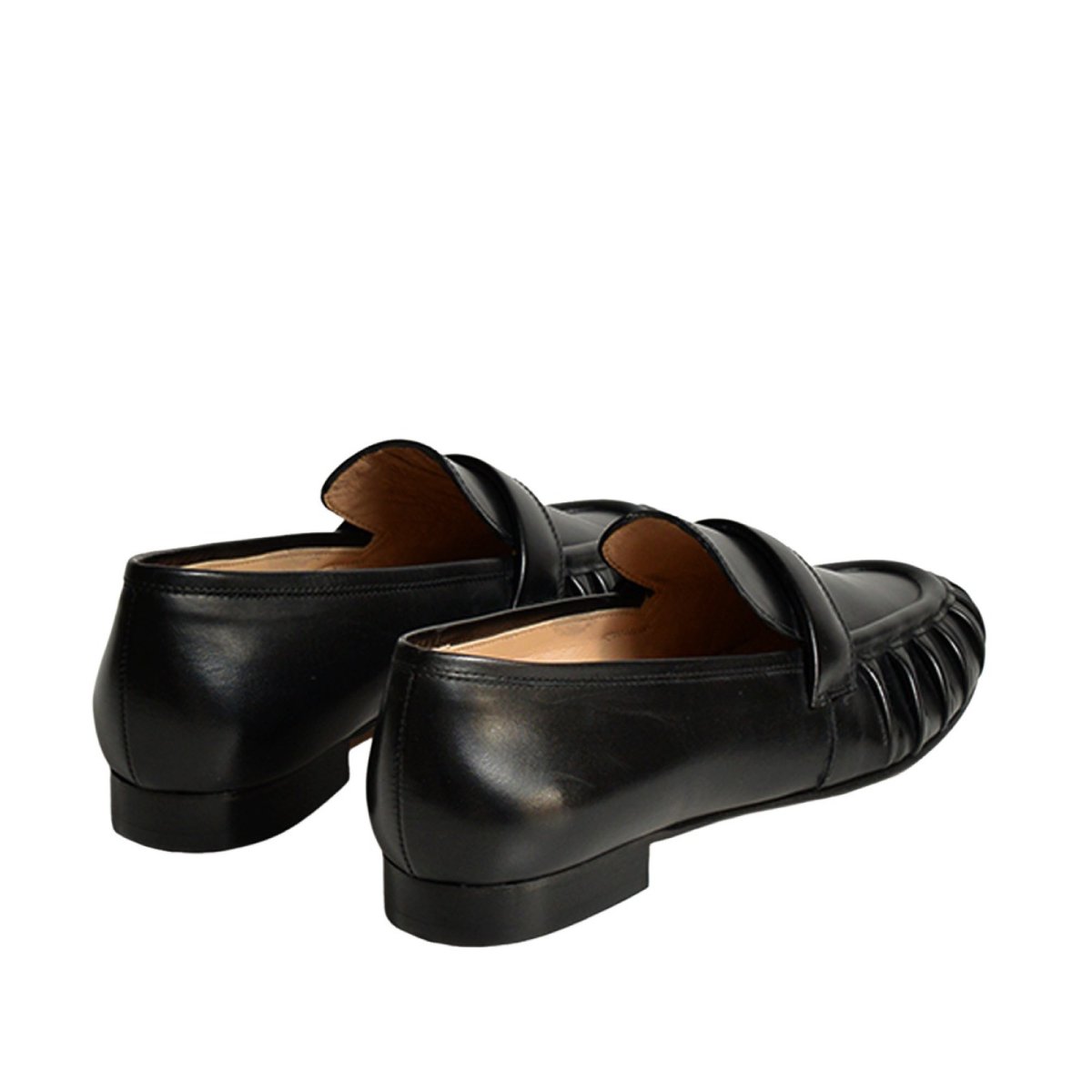 Mocassino in morbida pelle di vitello pieno fiore nera. Caratterizzata dalla tomaia arricciata e con accessorio a fascetta. Tacco di cm 1.5 e calzata regolare.