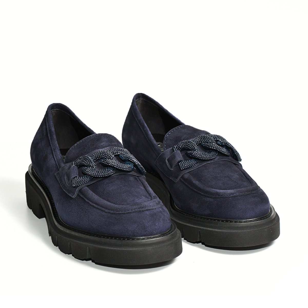 Mocassino in morbida pelle scamosciata blu con accessorio. Fondo ultraleggero e tacco di 2.5 cm. Calzata regolare.