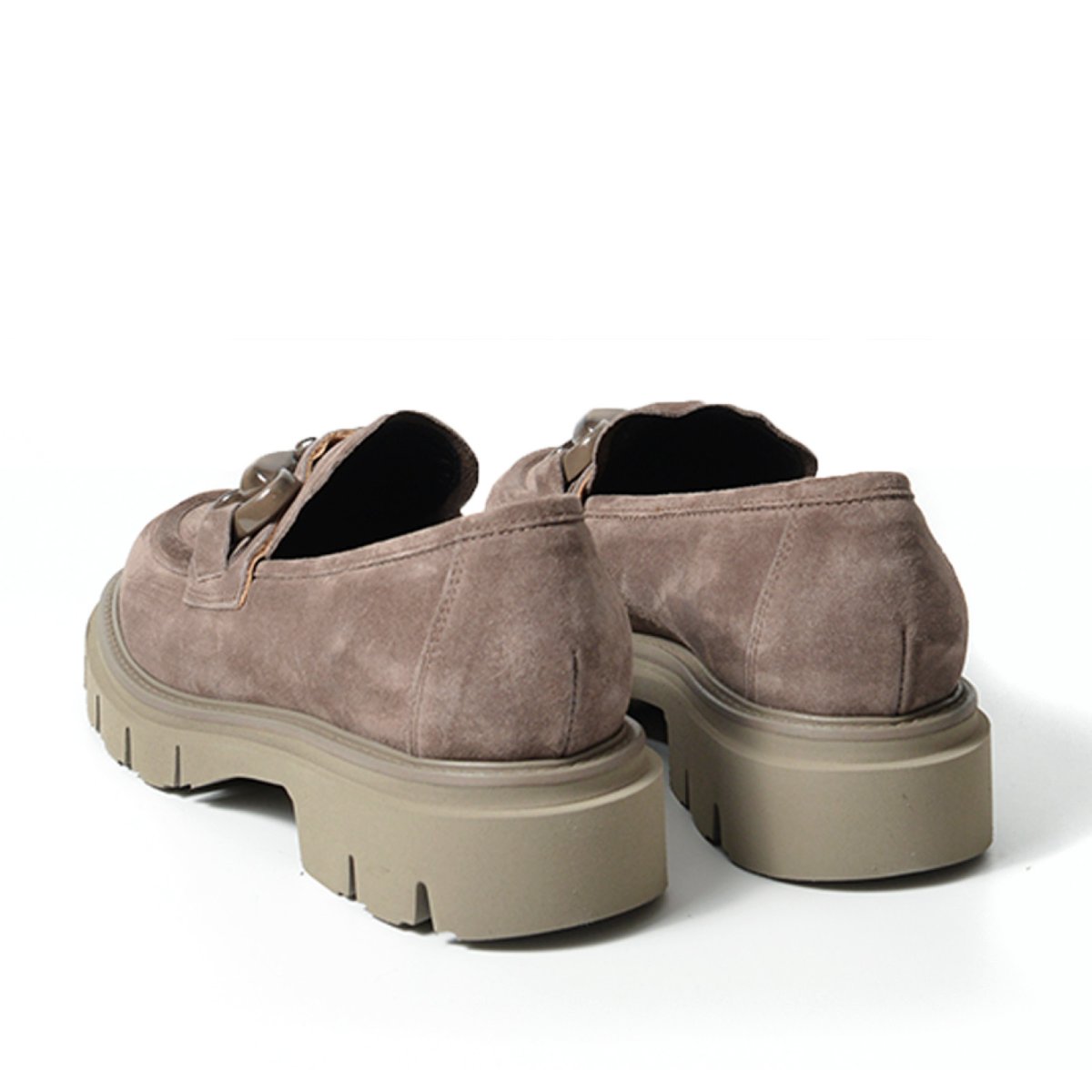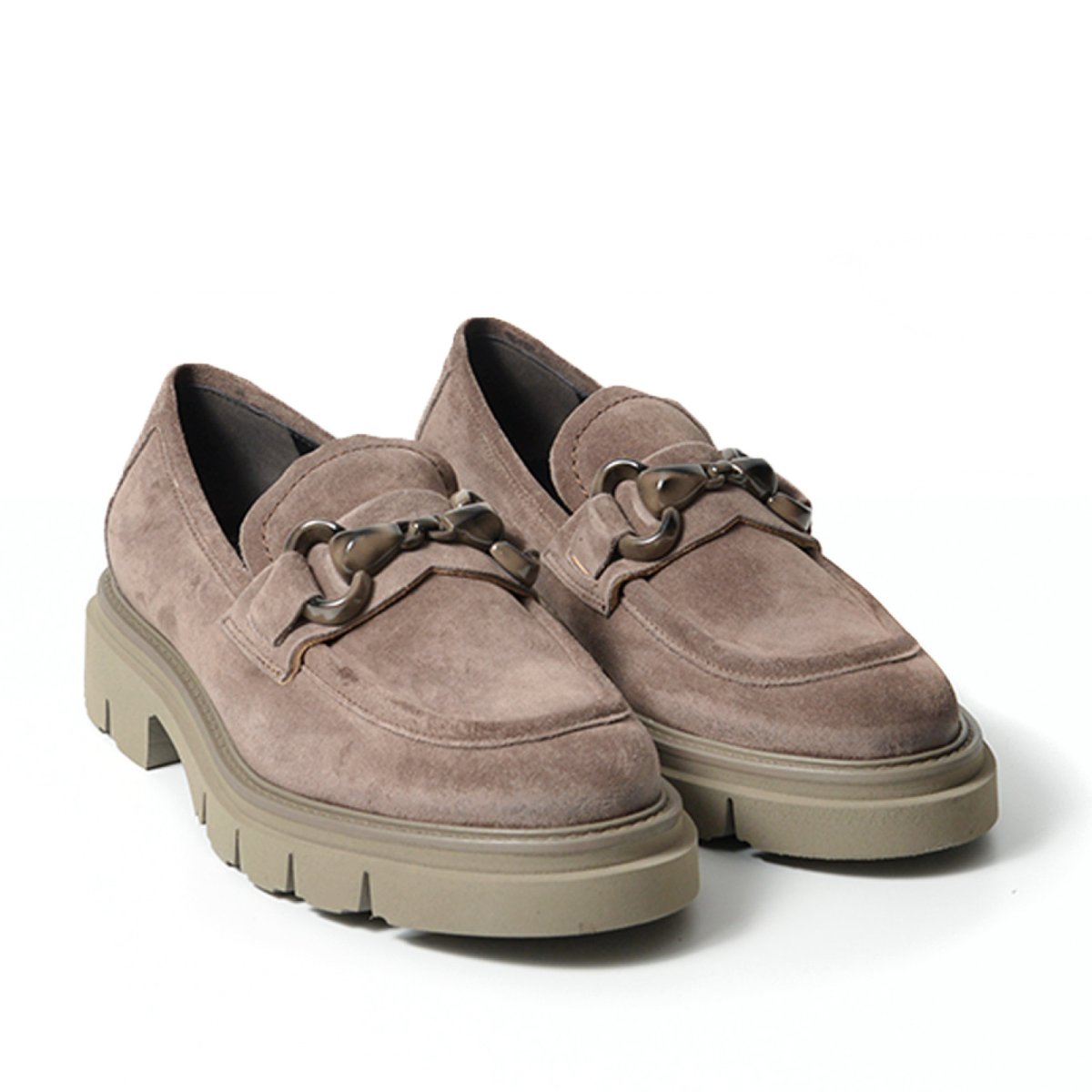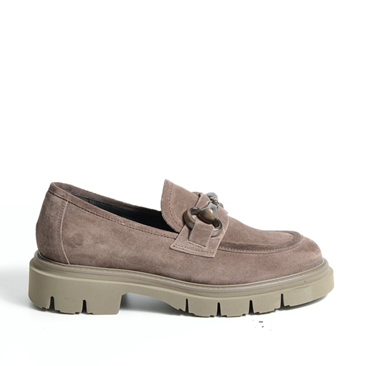 Mocassino in morbida pelle scamosciata marrone bisonte con morsetto maculato. Suola a dentata per un look aggressivo ma che sottolinea un look ricercato. Tacco di 2,5 cm. Calzata regolare.