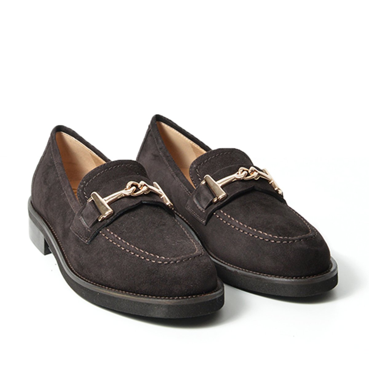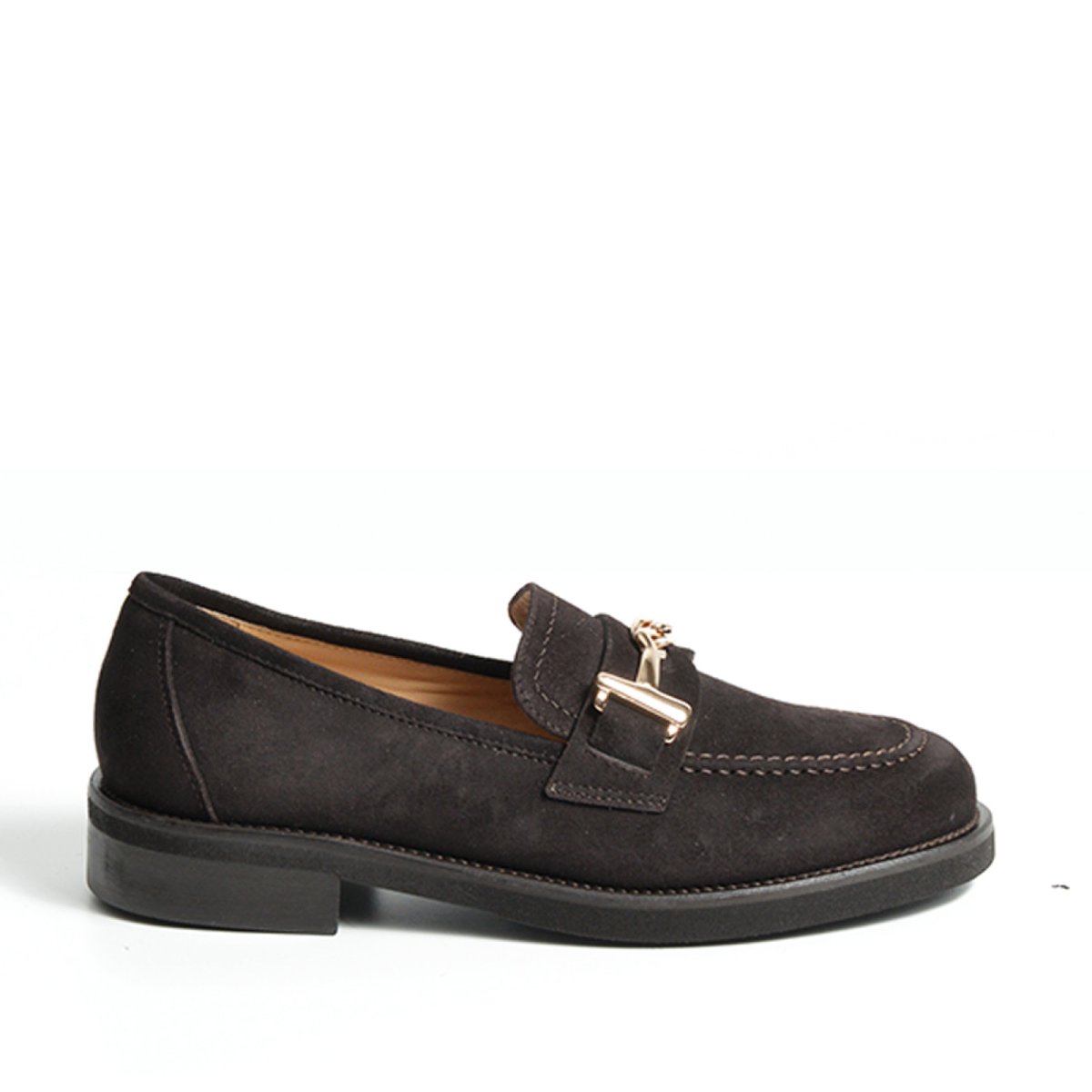 - Mocassino in morbida pelle scamosciata marrone scuro con morsetto dorato.