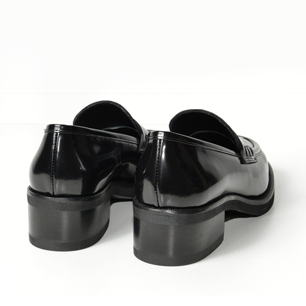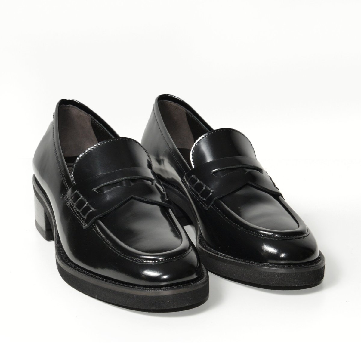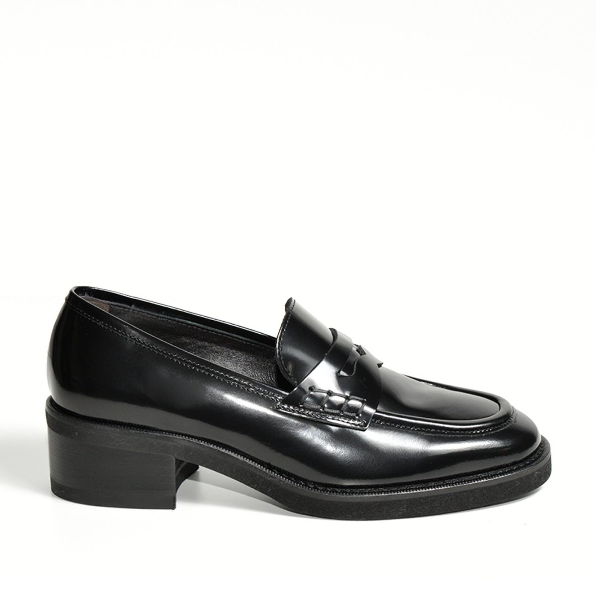 Mocassino in morbida pelle spazzolata nera con fascetta. Suola in gomma ultraleggera ha un tacco di 4 cm. Calzata regolare.