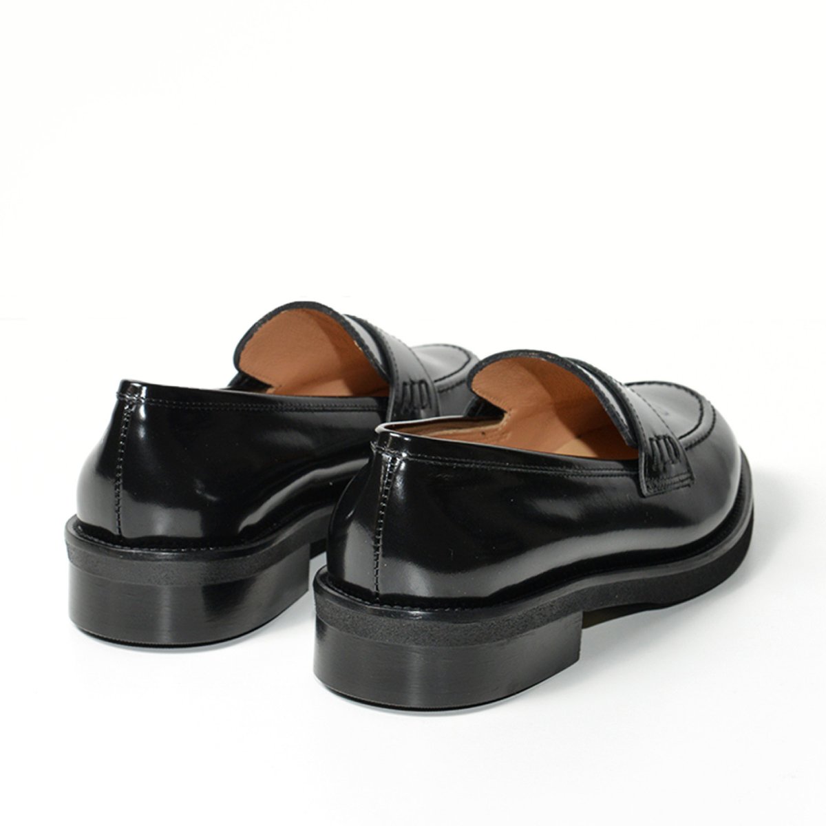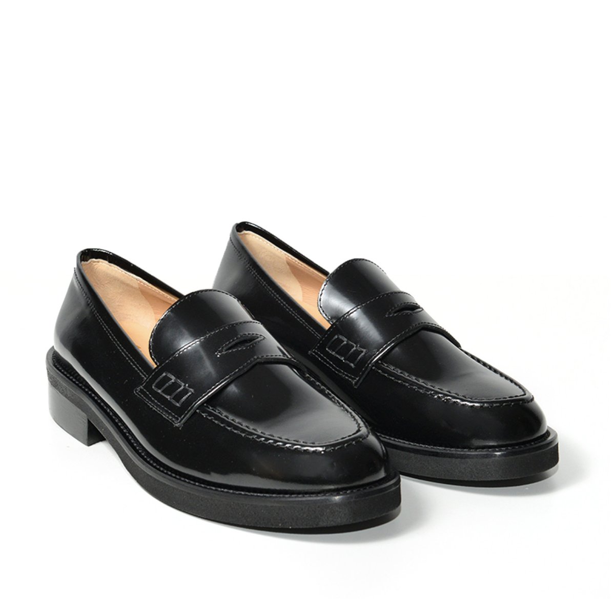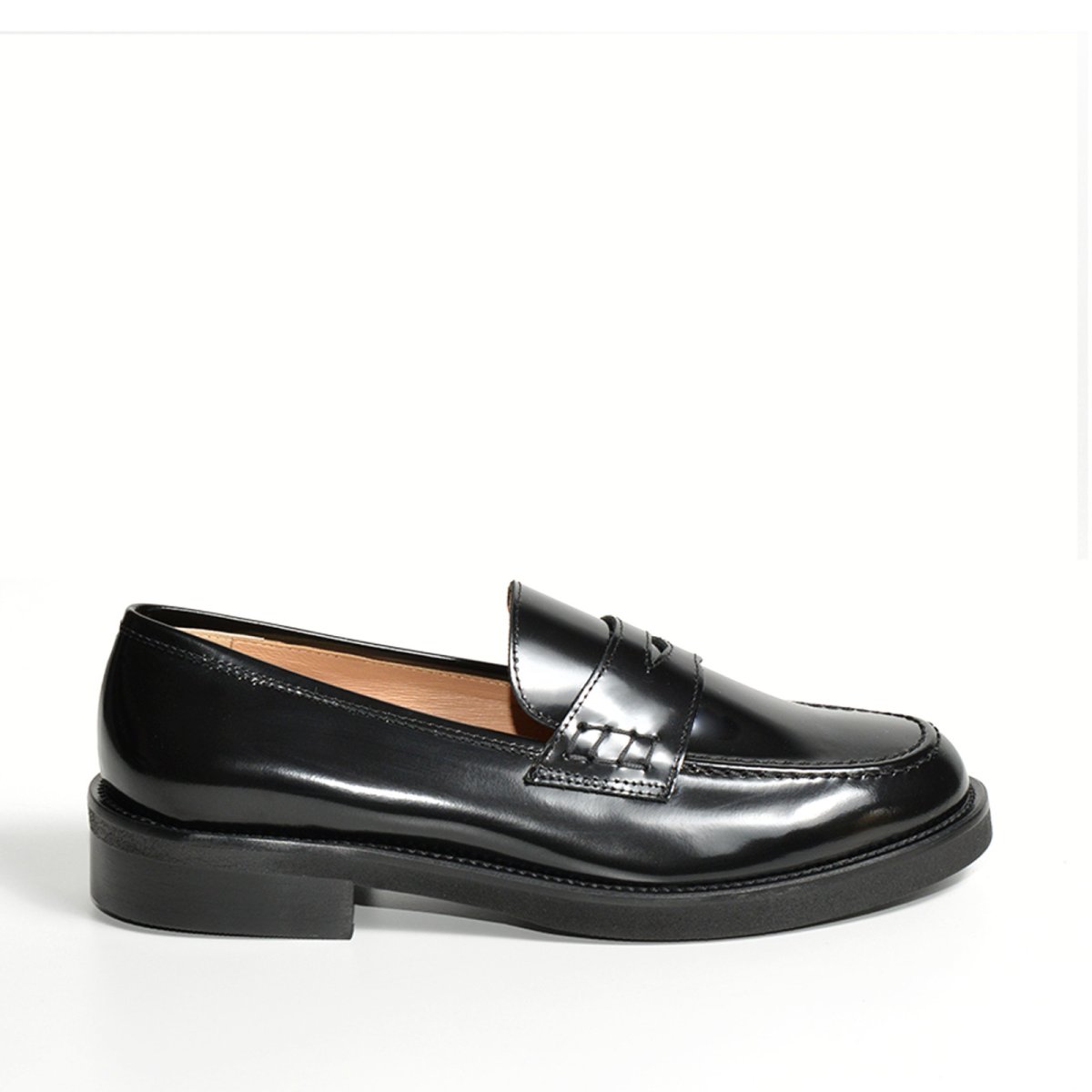 Mocassino in morbida pelle di vitello spazzolato nero con mascherina. Suola in gomma ultraleggera e tacco di 2.5 cm. Calzata regolare.