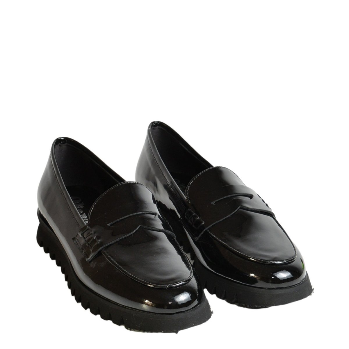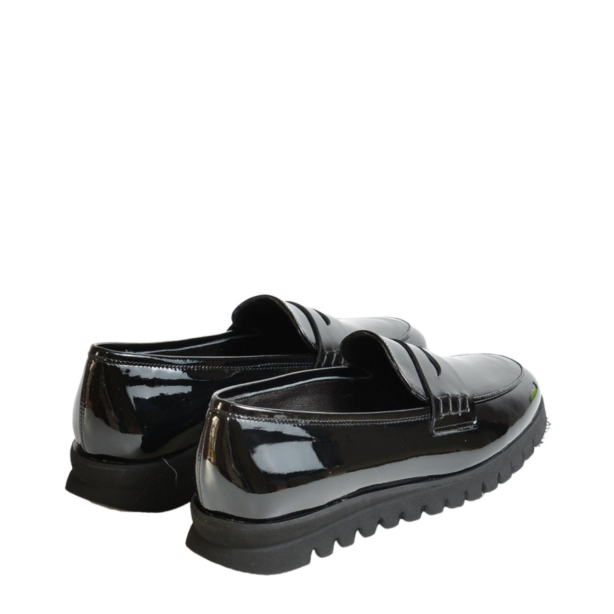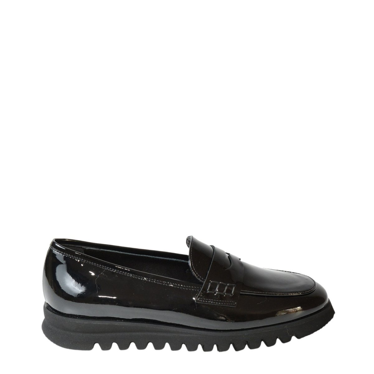 Mocassino in morbida vernice nera con mascherina. Zeppa in gomma ultraleggera di 3 cm. Calzata regolare.