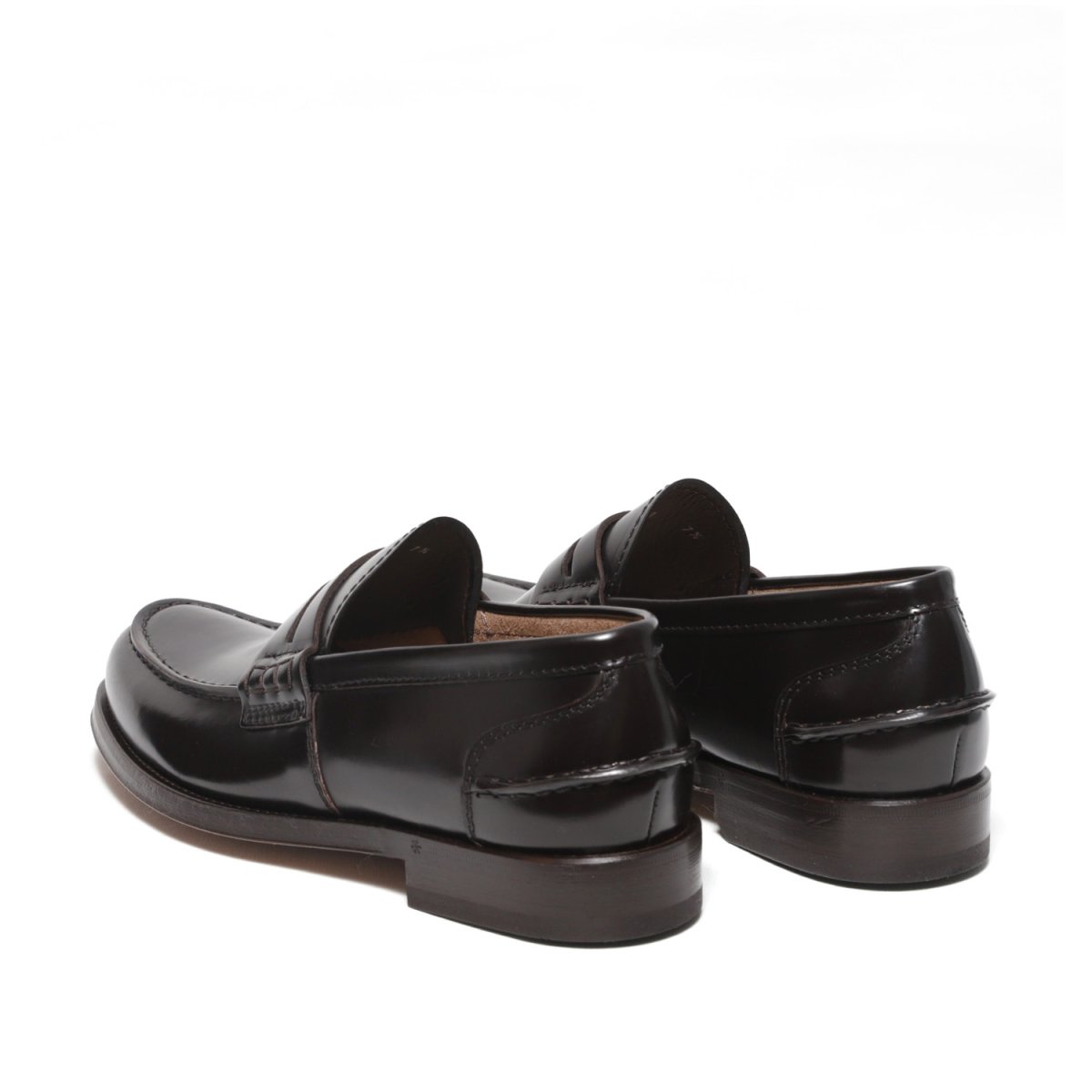- Mocassino con mascherina in vitello spazzolato ebano e suola in cuoio.
