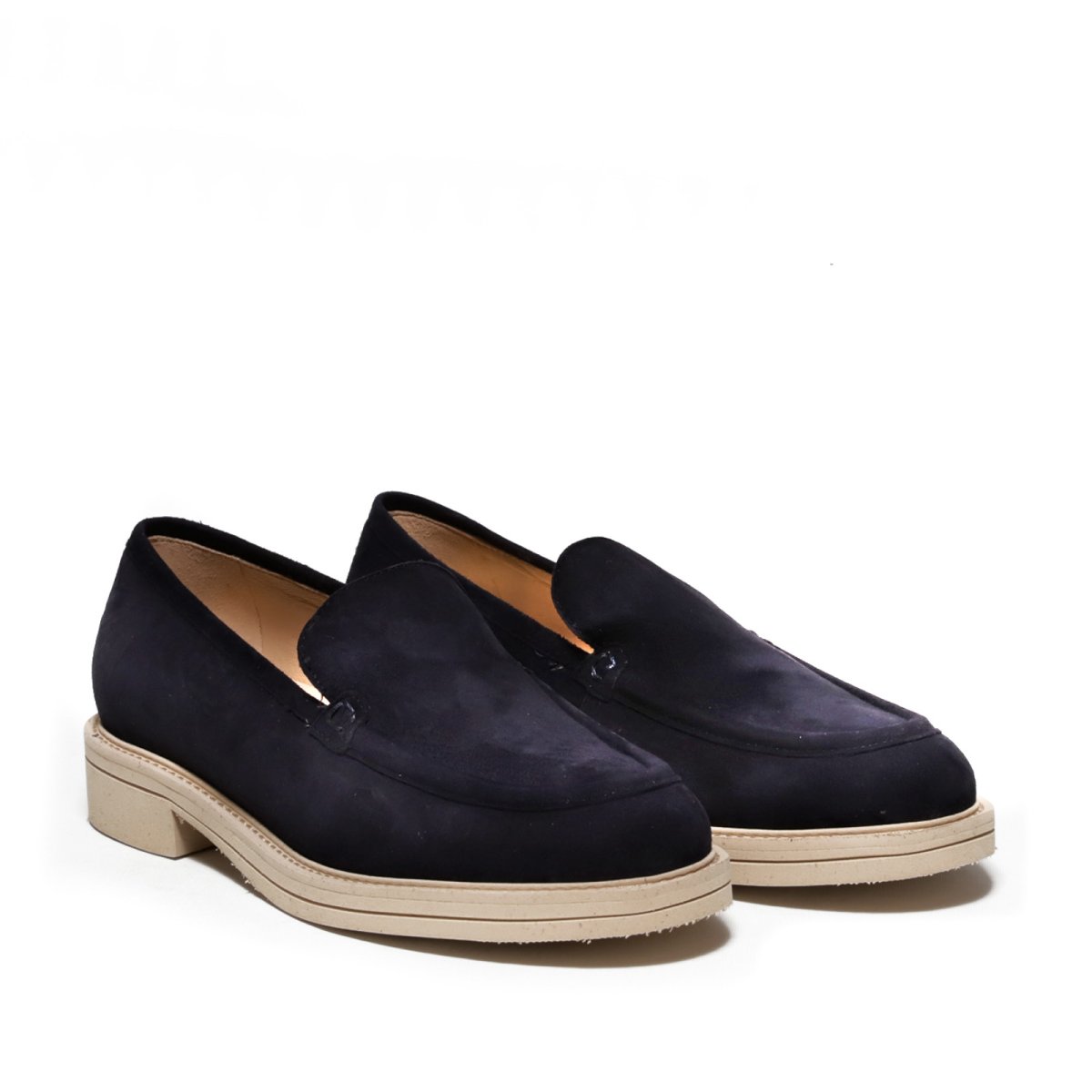 Mocassino liscio in morbido suede blu. Suola in gomma ultralight beige per un’altezza totale di 3 cm. Calzata regolare.