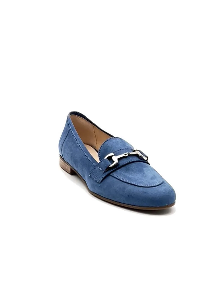 Si chiama “Olimpia” il nuovo mocassino di questa stagione, dalla forma a mandorla, realizzato in morbido camoscio cielo, con morsetto argento. Tacco cm 1, il fondo è in gomma.