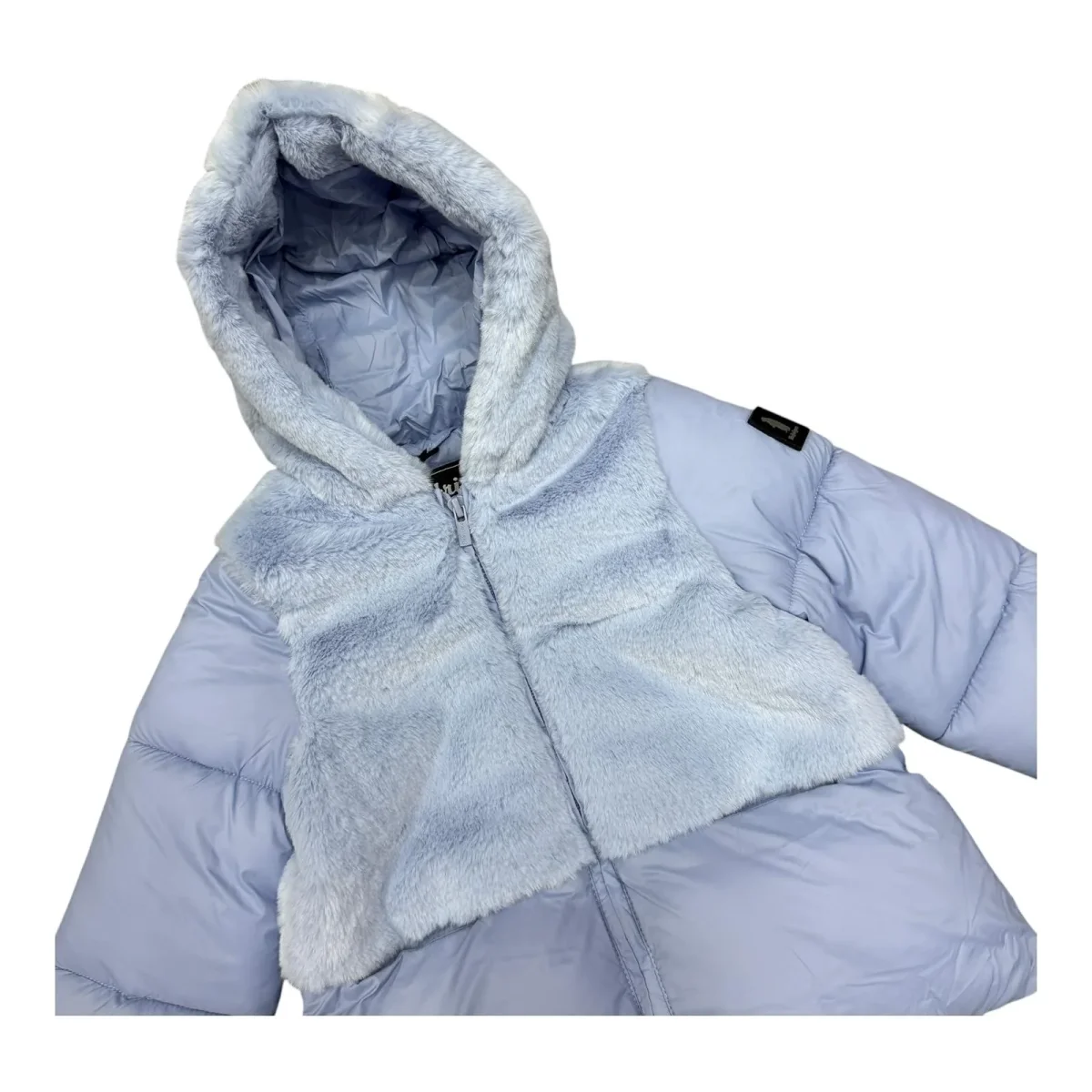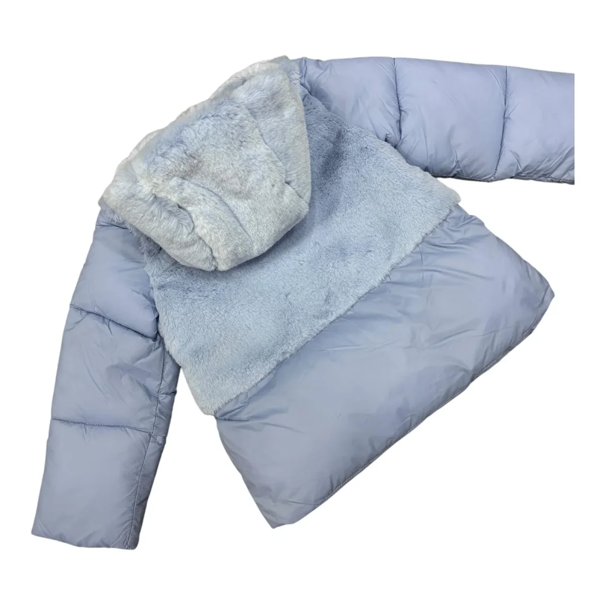 Piumino doppio tessuto con pelliccia, cappuccio fisso.