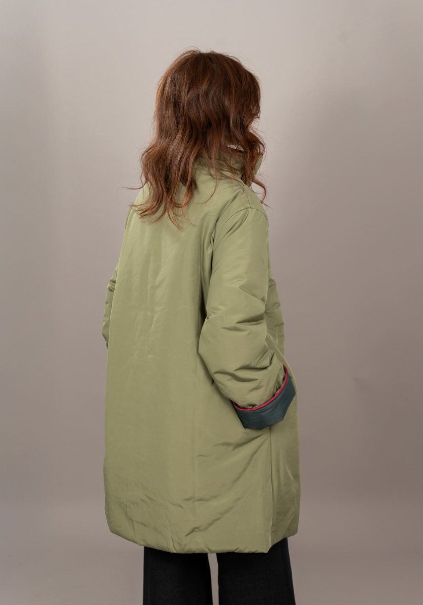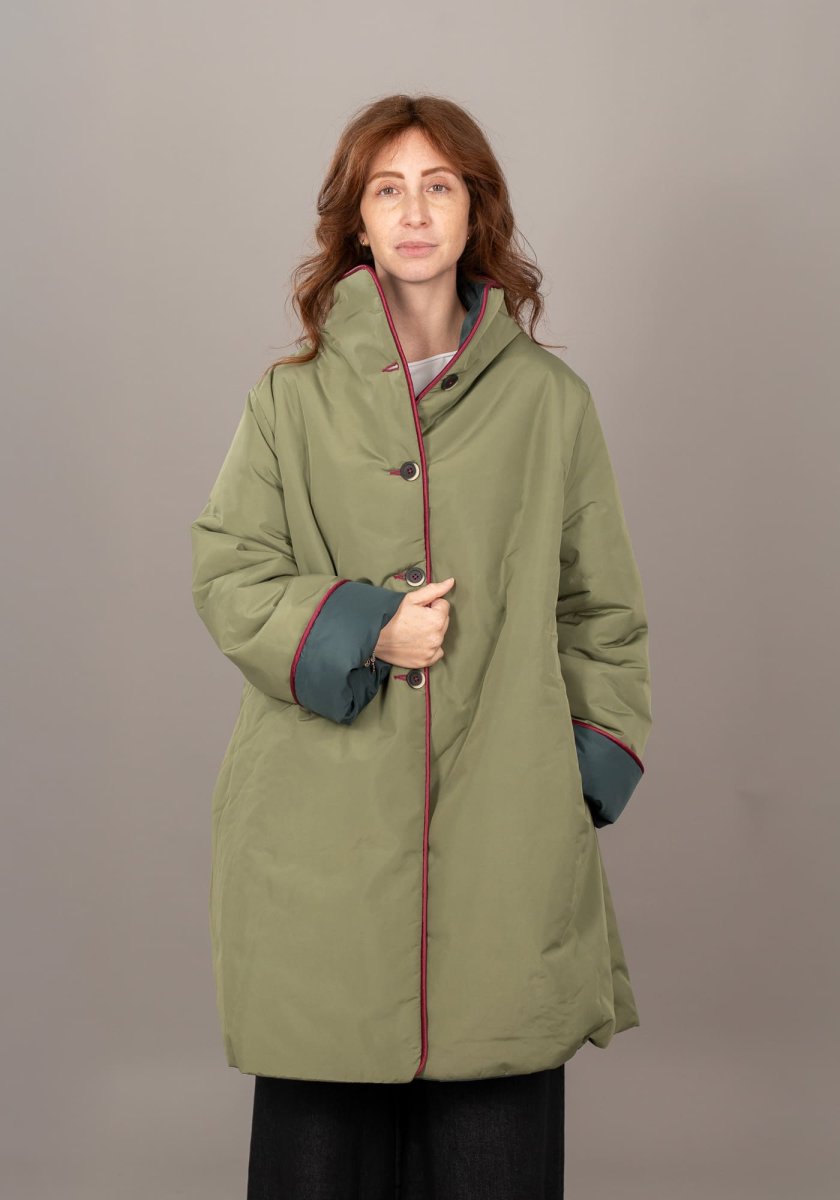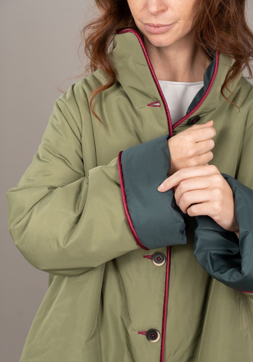 La linea morbida e il taglio over rendono questo piumino facilissimo da indossare sopra qualsiasi outfit, mentre i profili a contrasto aggiungono un dettaglio distintivo e ricercato.
