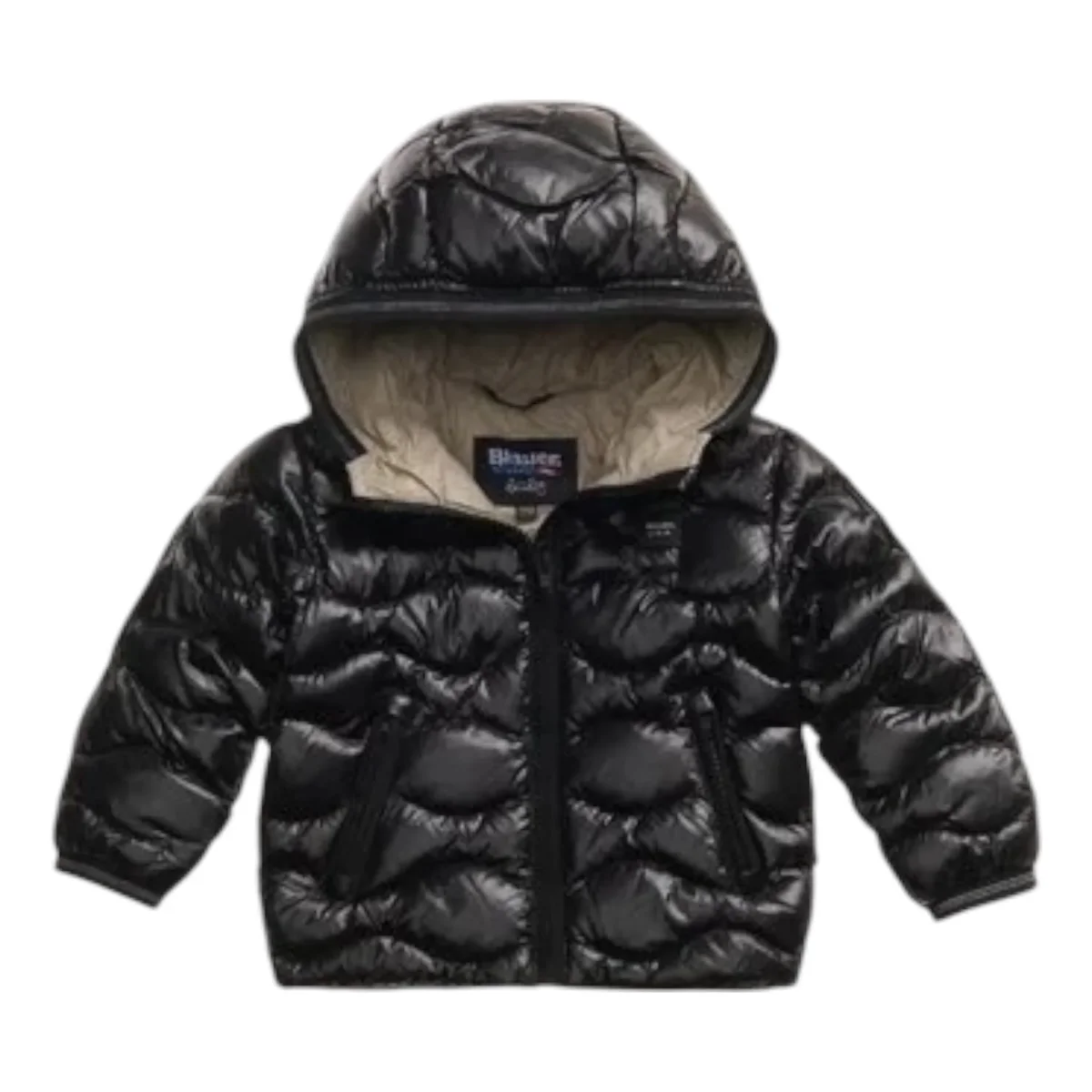 Giubbetto con cappuccio trapuntato ad onde orizzontali. Capo iconico Blauer dedicato a chi vuole un bambino vestito alla moda.