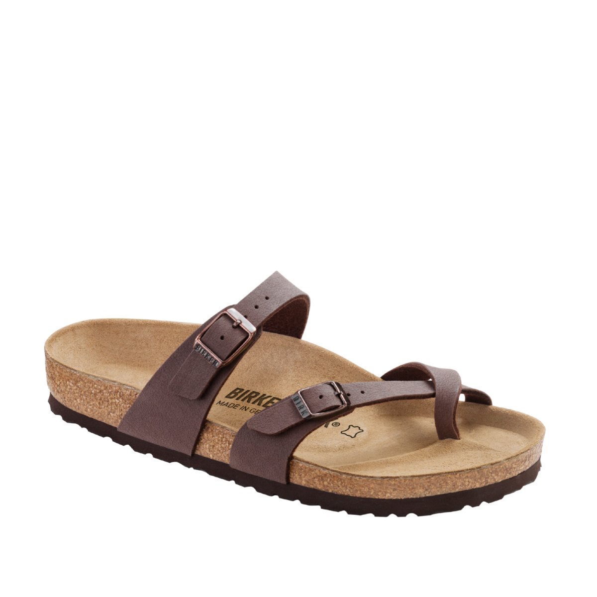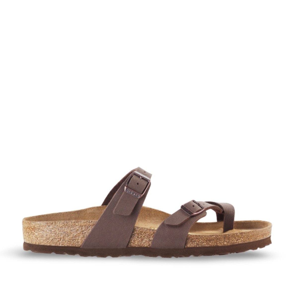 Sandalo infradito Birkenstock modello Mayari con cinturino attorno all’alluce. Tomaia in ecopelle Birke-Flor* marrone. Plantare anatomico in sughero e lattice foderato in pelle scamosciata. Calzata regolare.