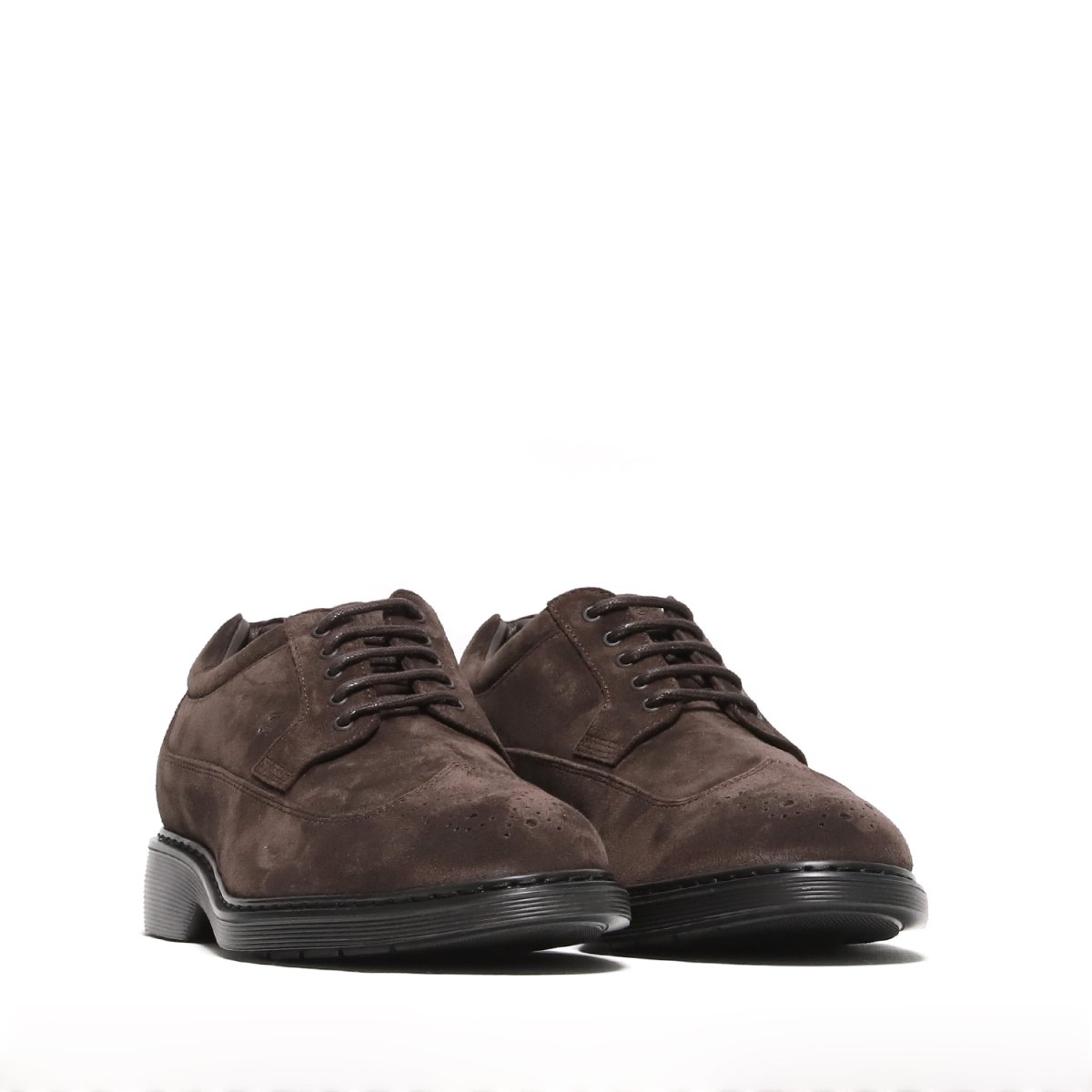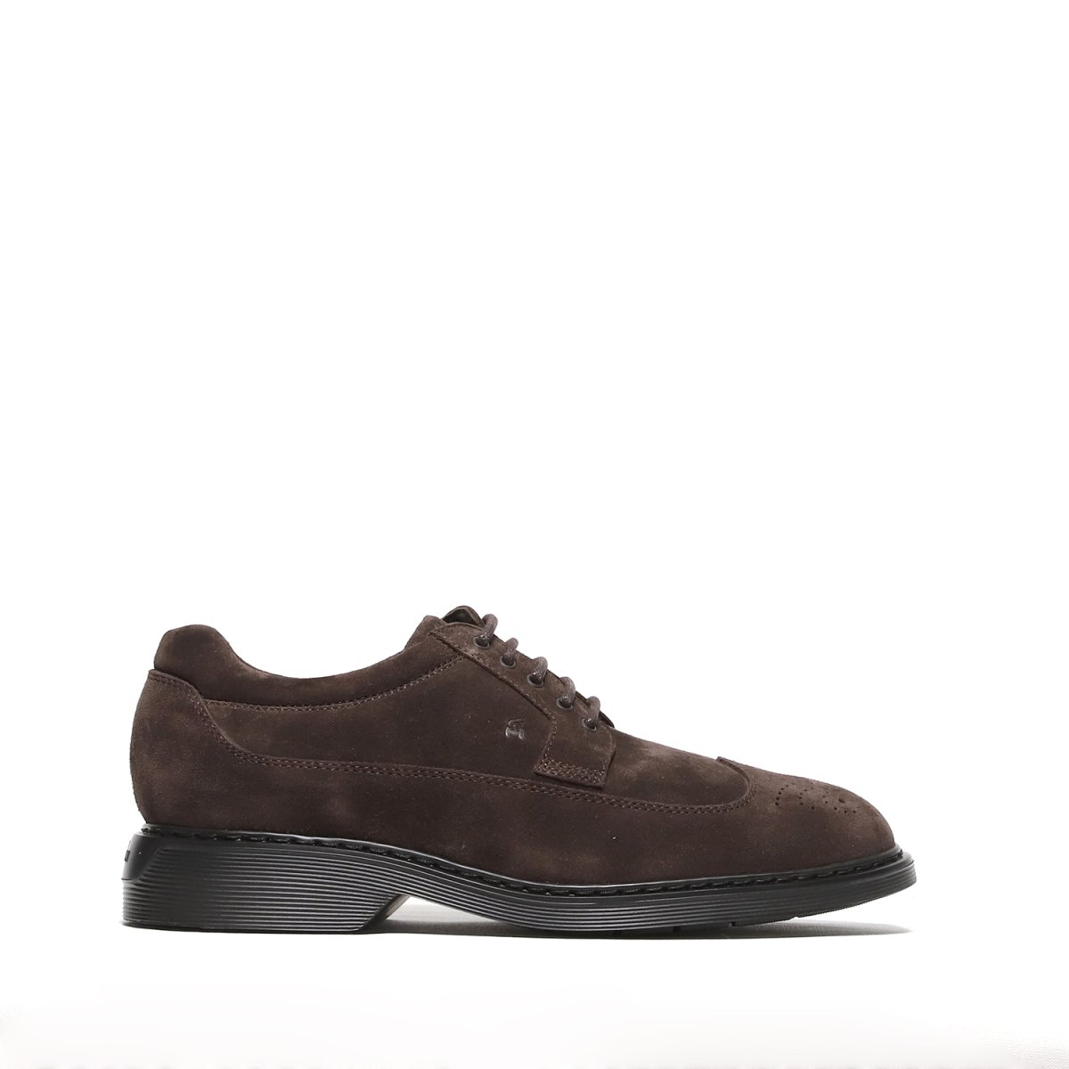 Scarpa allacciata a derby con motivo a coda di rondine sul puntale Realizzata in suede ebano con suola in gomma ultraleggera e plantare interno in memory foam Calzata regolare