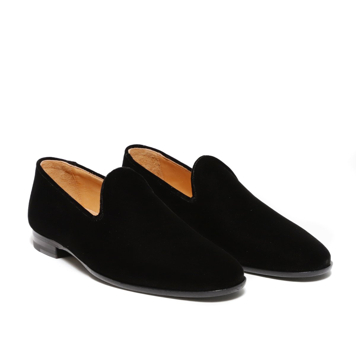 Scarpa a pantofola in morbido velluto nero. Fodera in pelle e suola in cuoio. Calzata regolare.
