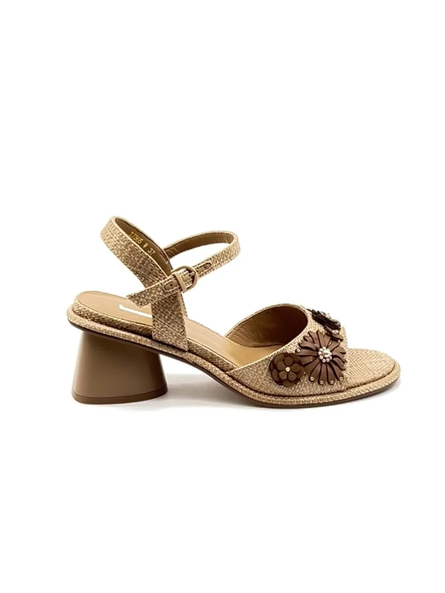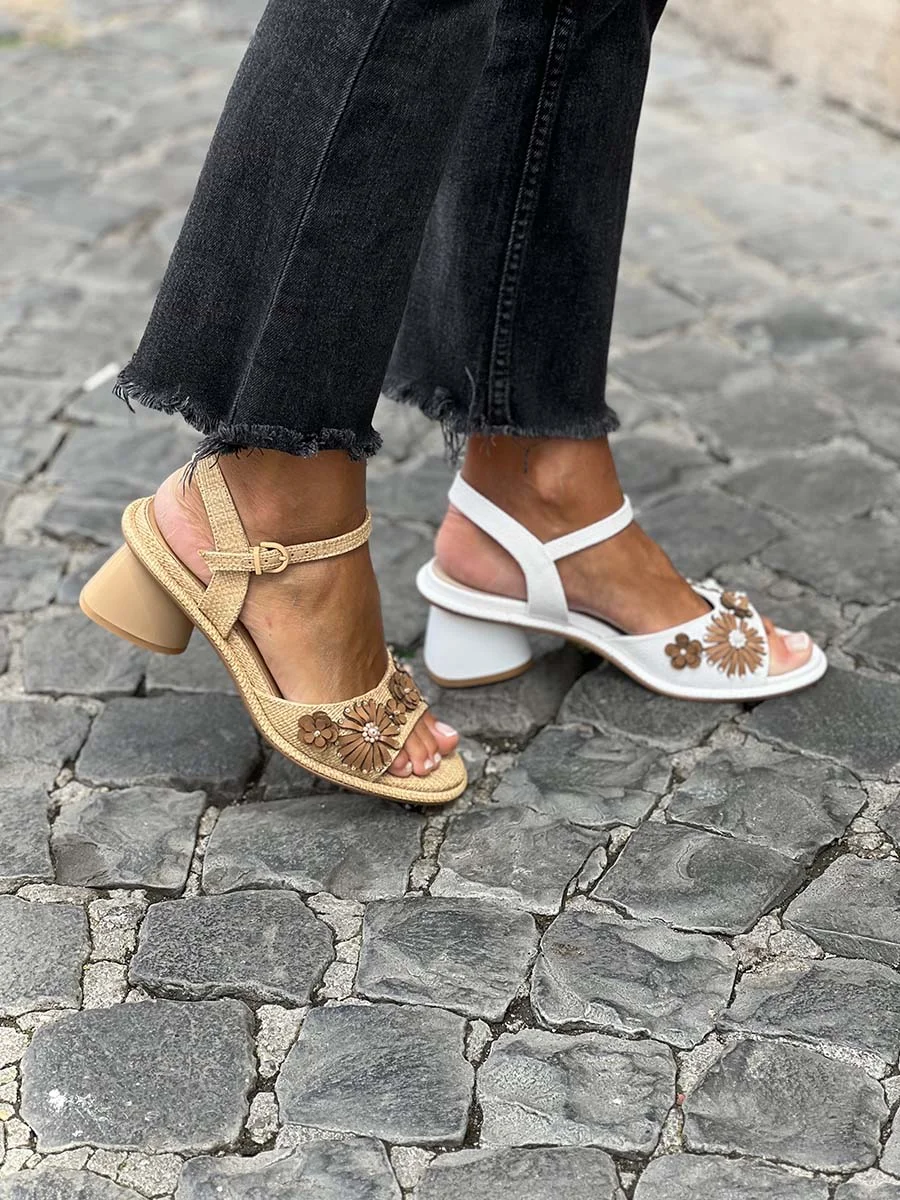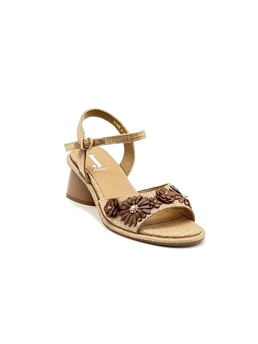 Si chiama “Simonetta” il nuovo sandalo di “Jeannot”, dalla forma stondata, realizzato in morbida rafia beige con fiori a contrasto in nappa cuoio, cinturino regolabile alla caviglia. Tacco largo cm 5. Il fondo è in cuoio.