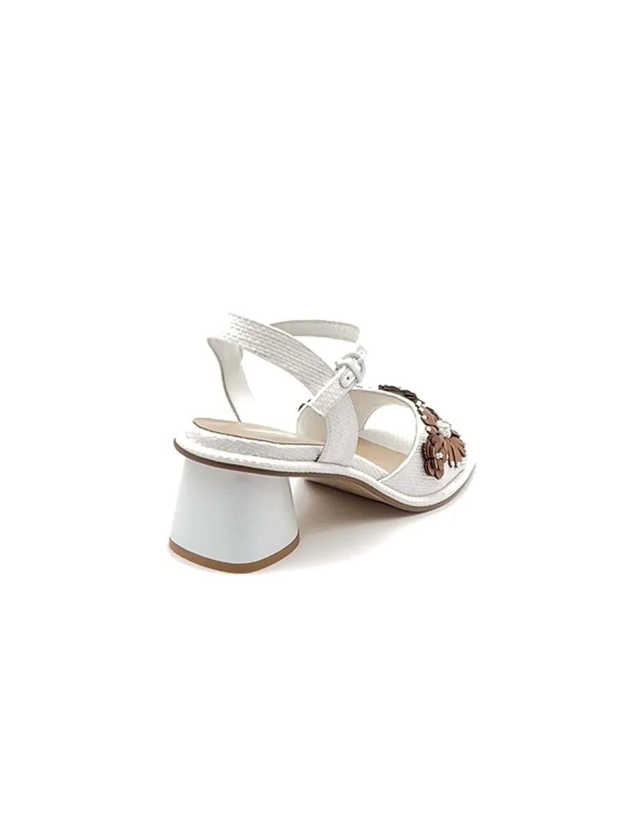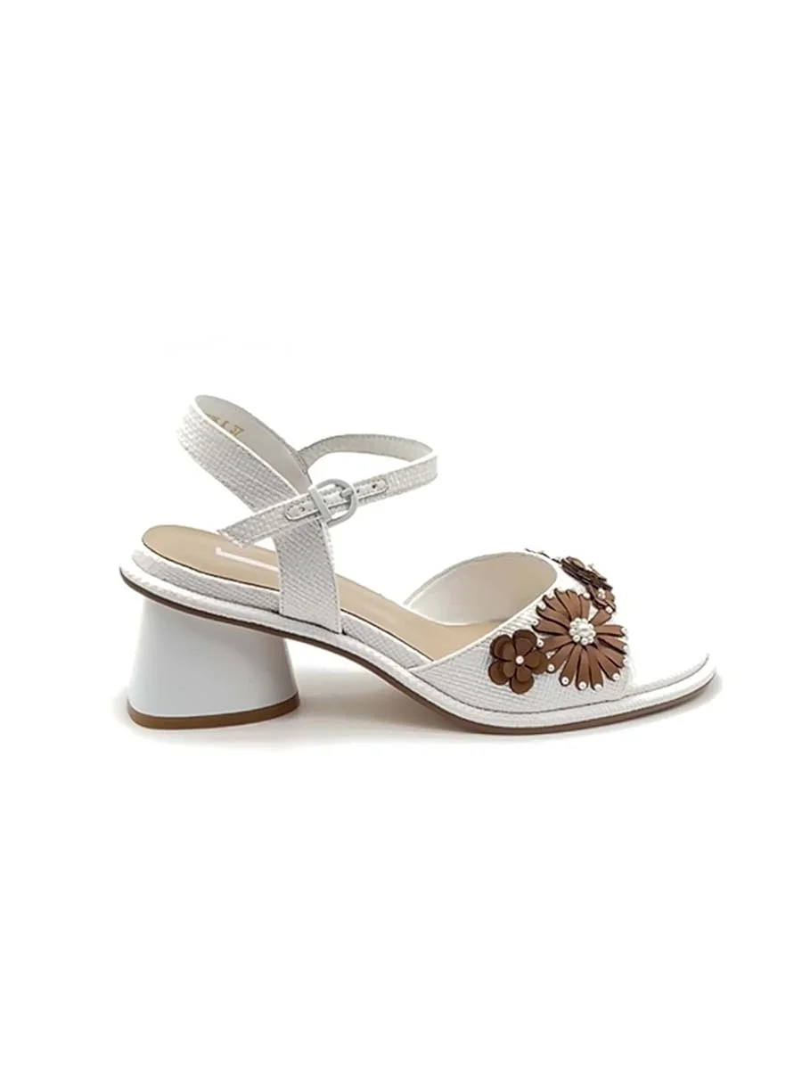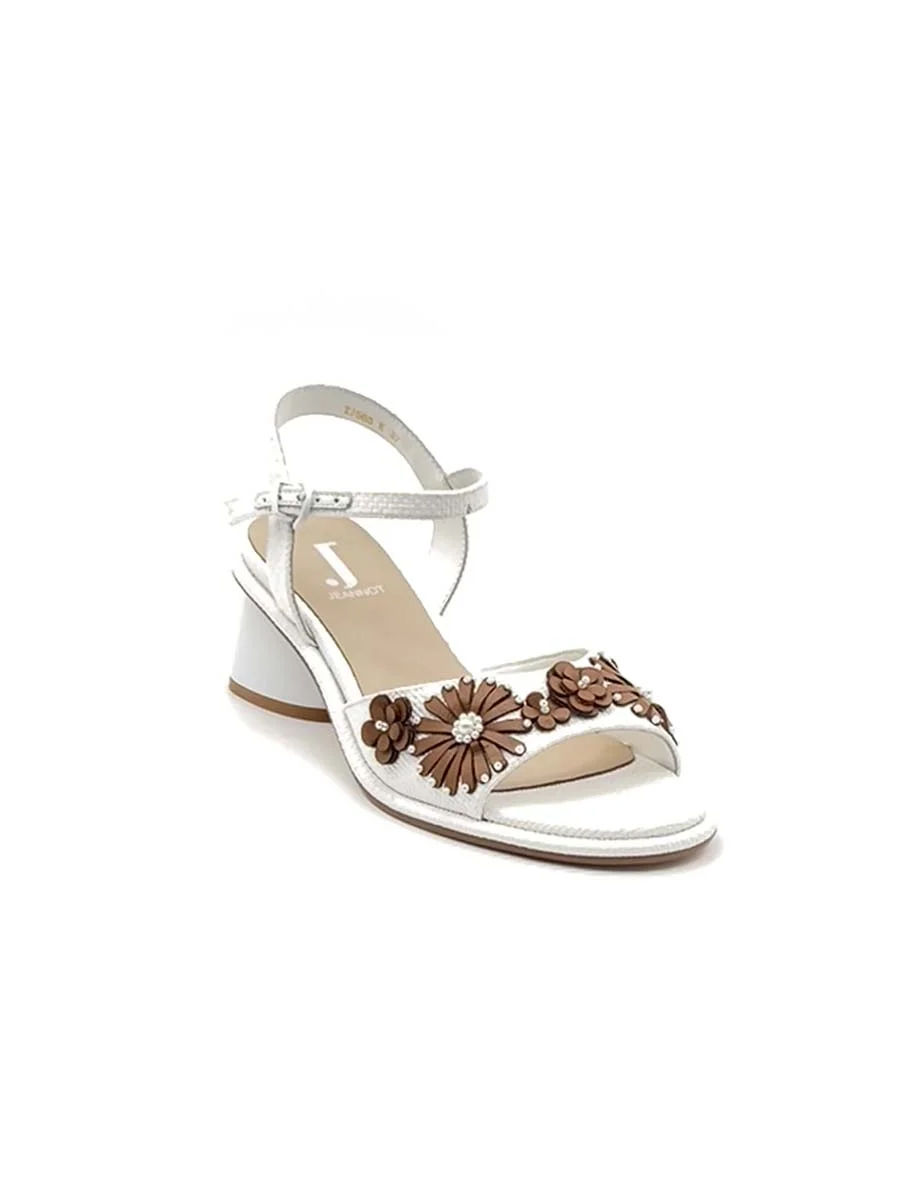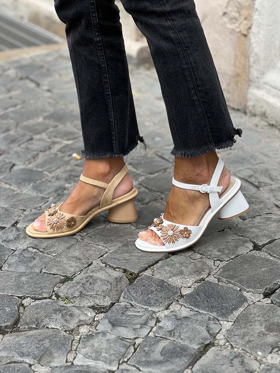 Si chiama “Simonetta” il nuovo sandalo di “Jeannot”, dalla forma stondata, realizzato in morbida rafia bianca con fiori a contrasto in nappa cuoio, cinturino regolabile alla caviglia. Tacco largo cm 5. Il fondo è in cuoio.
