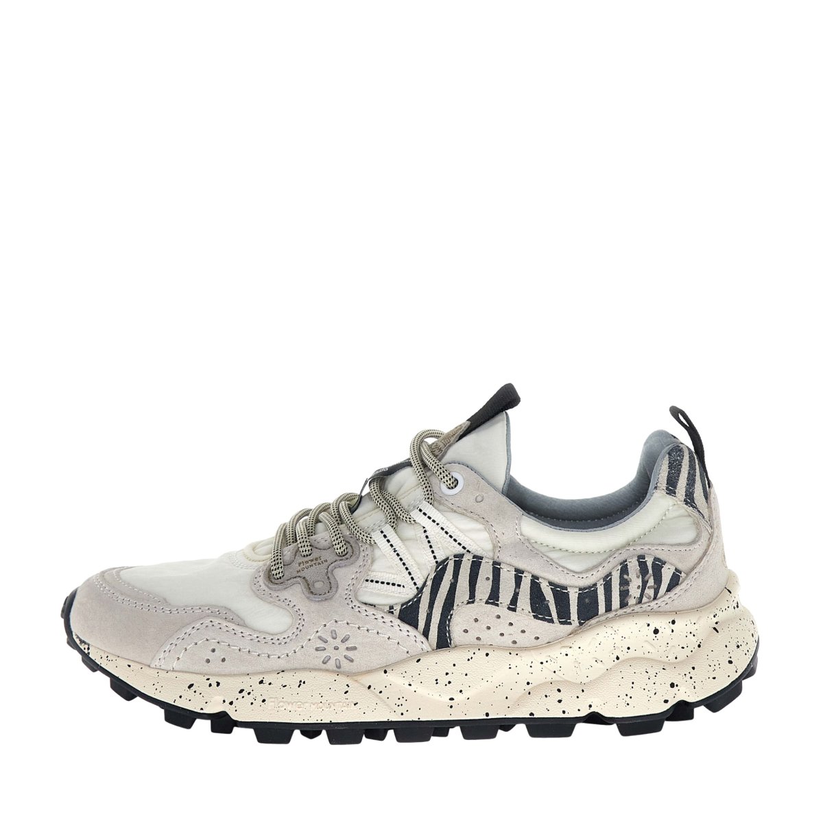 Sneaker Flower Mountain modello Yamano 3. Sportiva dal look metropolitano in suede e tessuto tecnico bianco con riporti animalier. Soletta interna in sughero anatomica e antibatterica. Suola dentata per un grip ottimale.