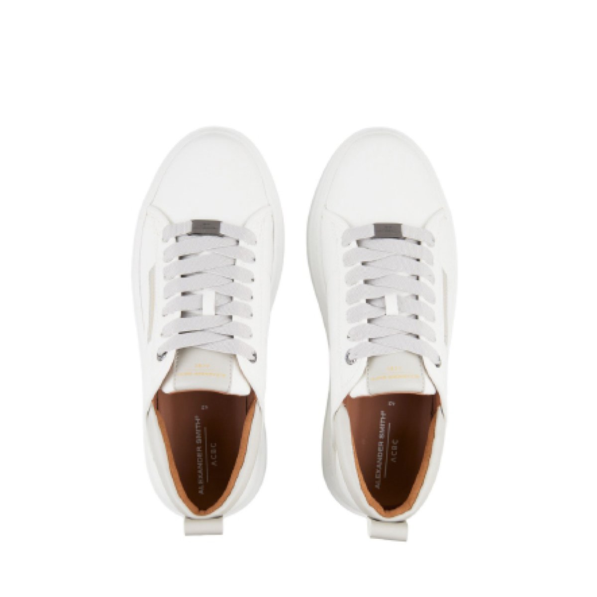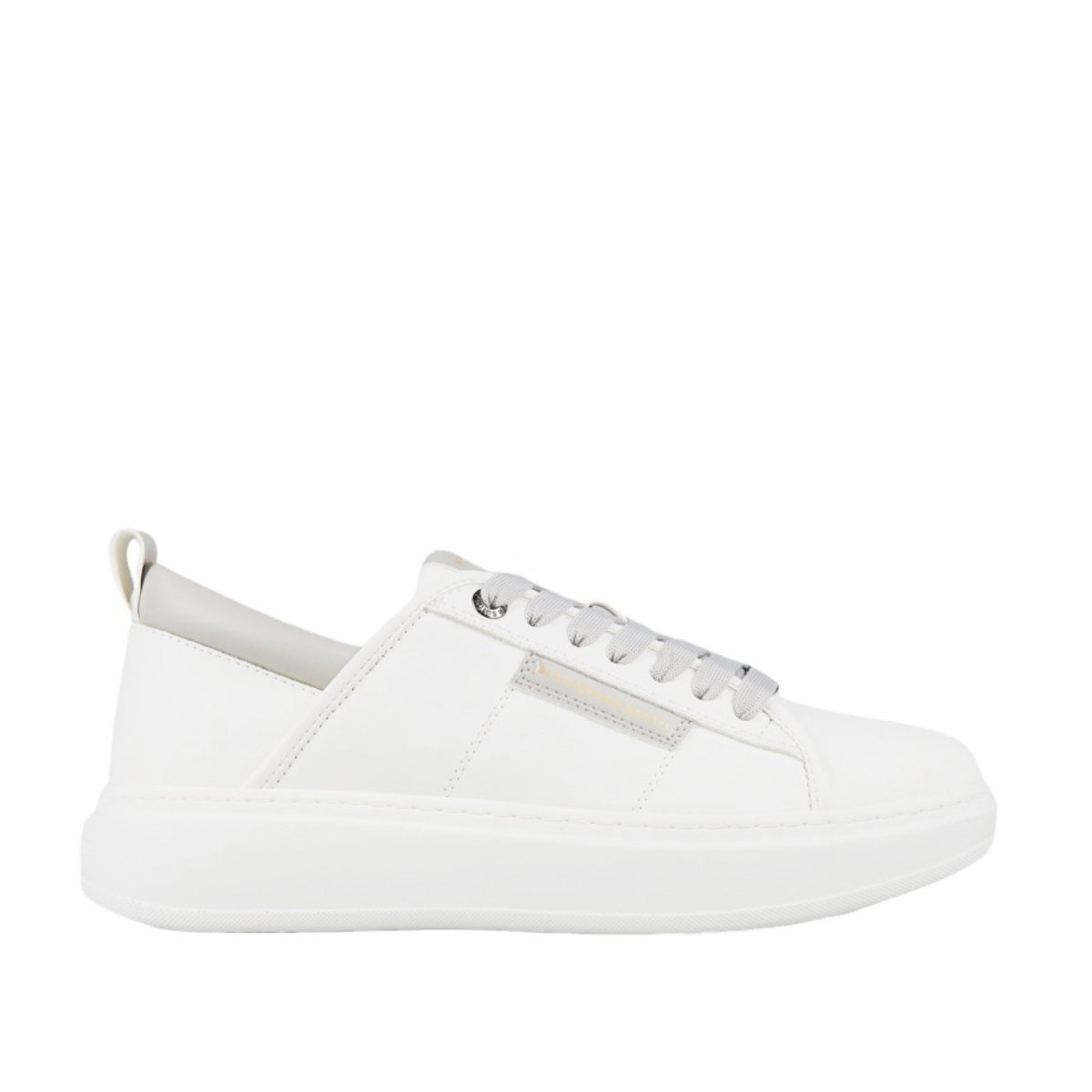 Sneaker Alexander Smith modello Eco-Wembley. Realizzata in pelle vegetale bianca con profilo sperone grigio perla. Suola in gomma riciclata. Logo laterale e lacci grigio perla per un’altezza totale di cm 4. Calzata regolare.