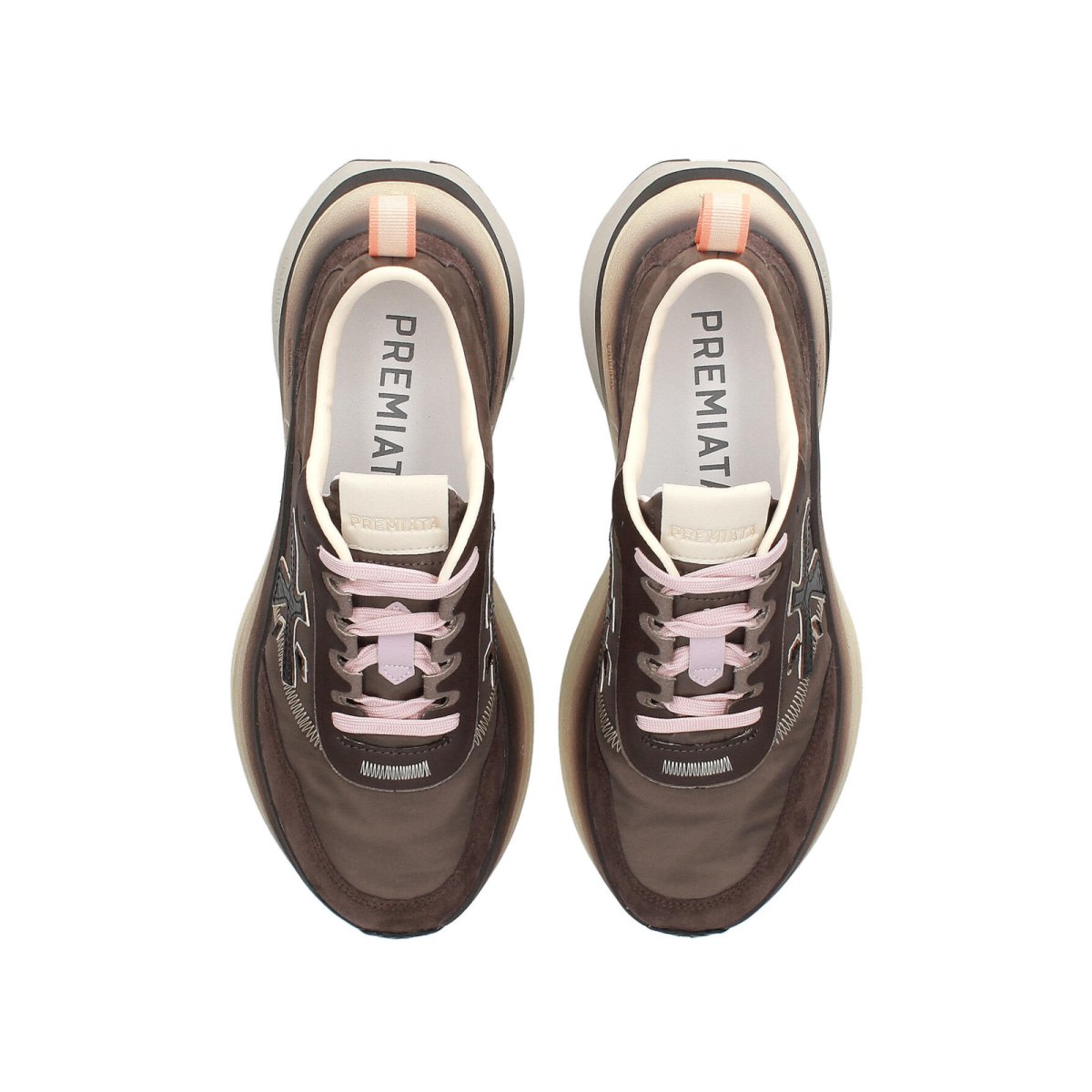 Sneaker Premiata donna modello Hill. Caratterizzata da una suola rialzata per un look casual moderno. Realizzata in suede e tessuto tecnico marrone e logo laterale in pelle vintage nera. Ha lacci rosa e suola logata sfumata. Calzata regolare.