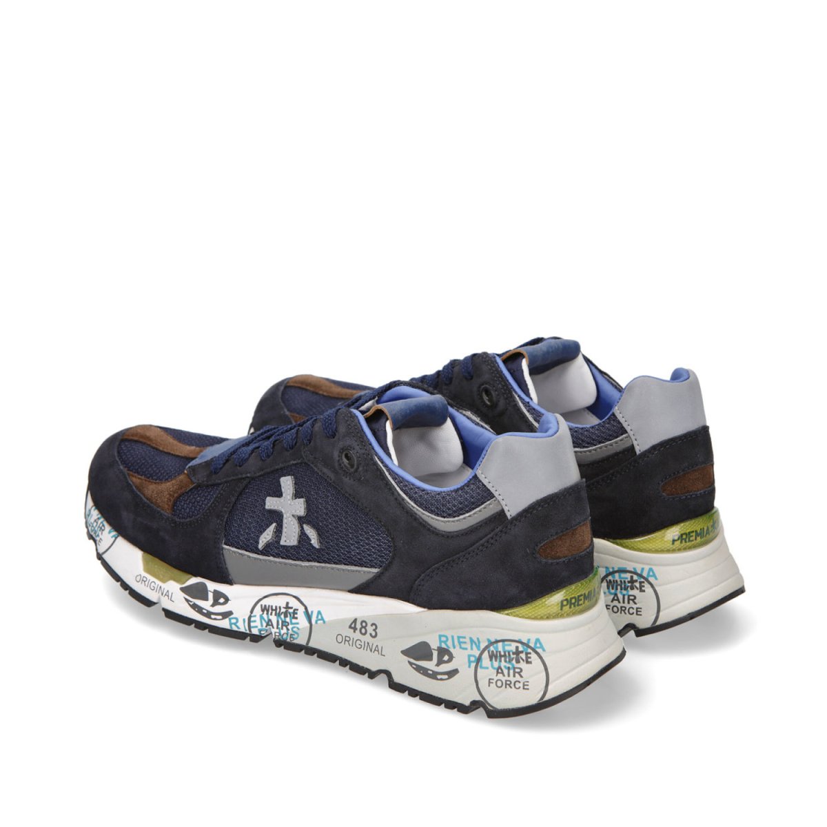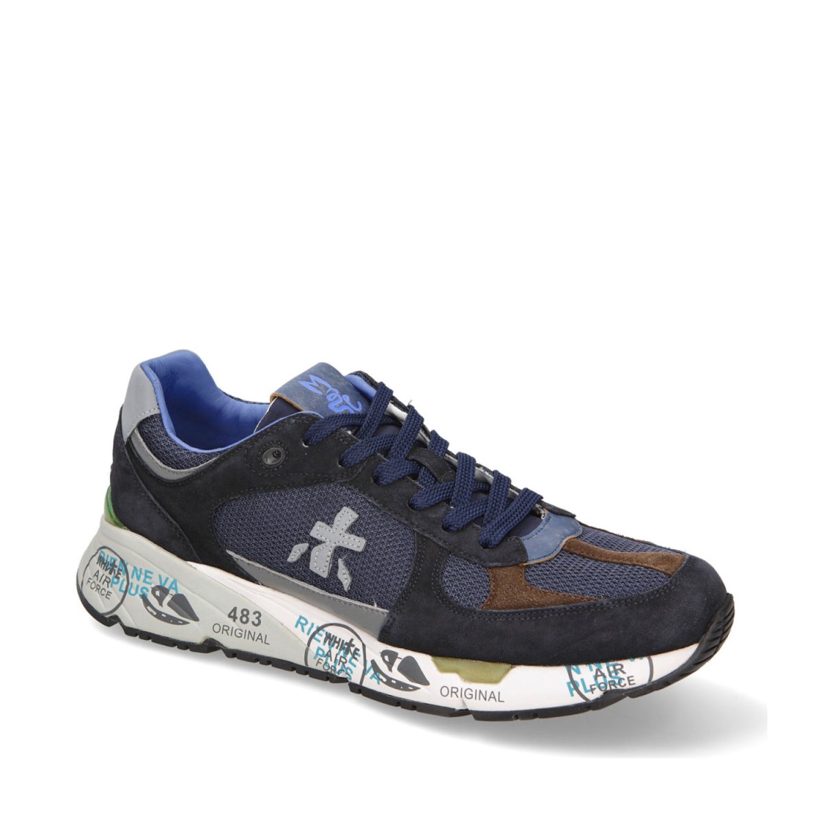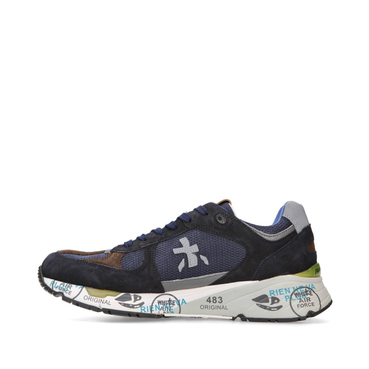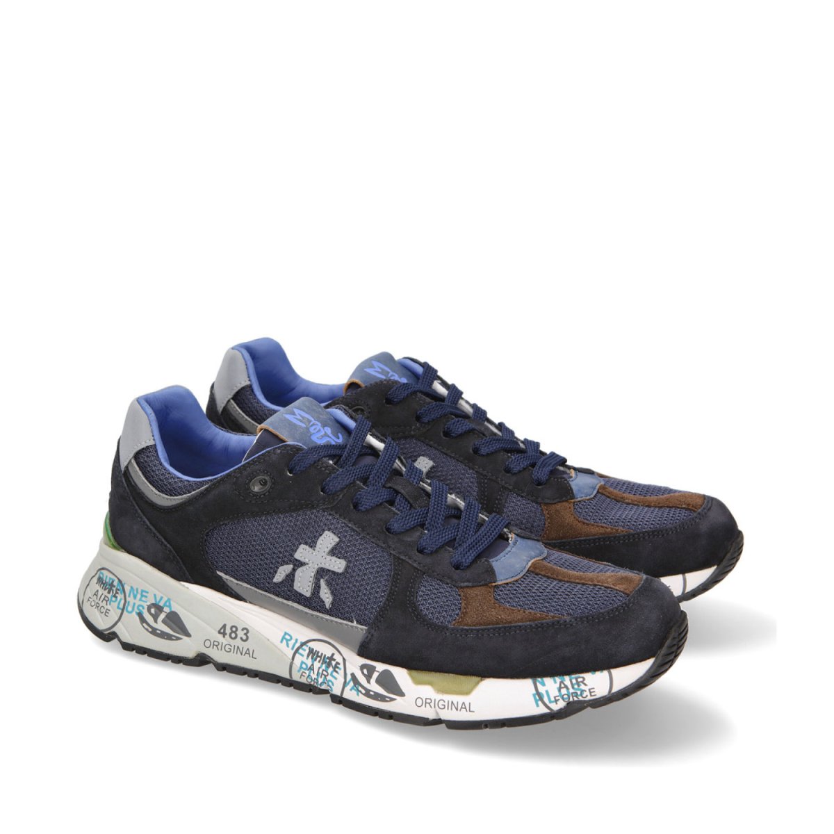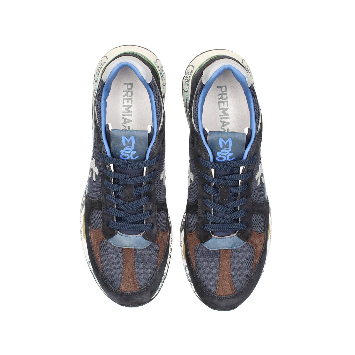 Sneaker Premiata uomo modello Mase realizzata in suede e tessuto tecnico blu. Inserti anteriori in suede marrone etop in pelle azzurra. Suola in gomma logata plantare estraibile per una calzata comoda e morbida.