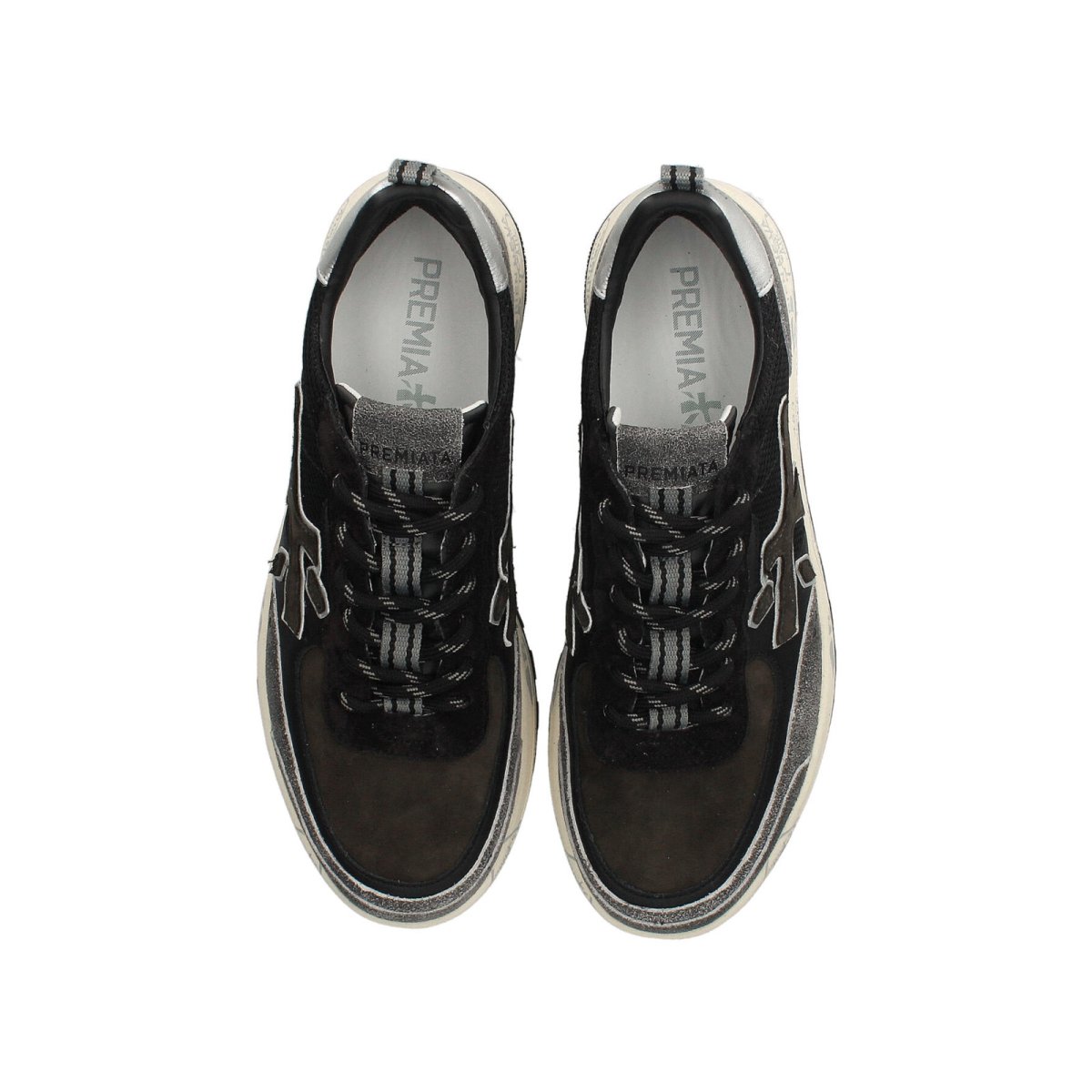 Sneaker Premiata uomo modello Nous. Realizzata in pelle effetto cracle’ grigio nabuk marrone e tessuto tecnico nero con inserti in suede e pelle nera. Topponcino posteriore e profilo del logo in pelle argento. Suola logata a contrasto e plantare estraibile. Calzata regolare.