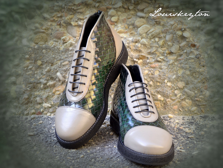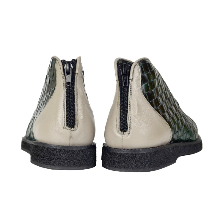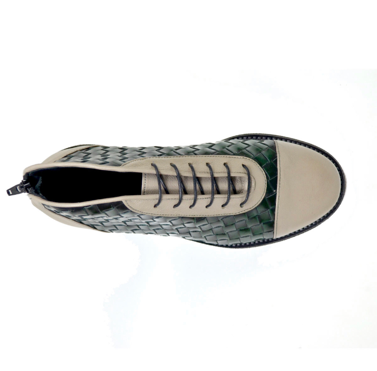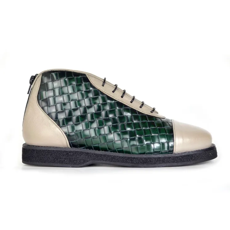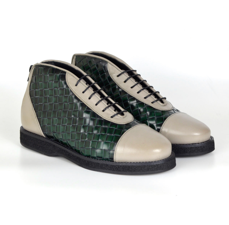 La sneakers uomo Abele – art.108a è una sneakers realizzata con morbido vitello grigio chiaro e intreccio su base pellame Abrasivato Polished spazzolato verde bottiglia.