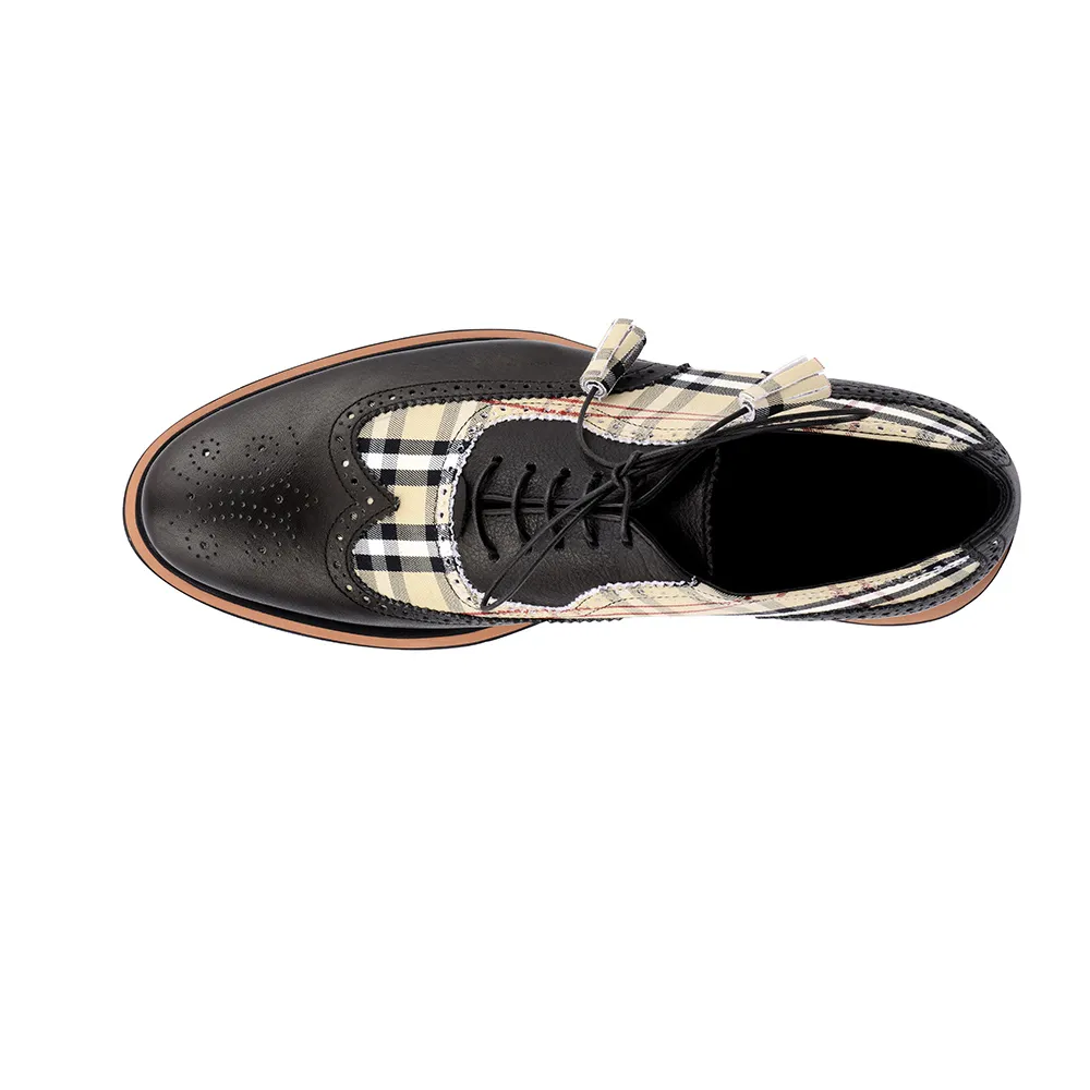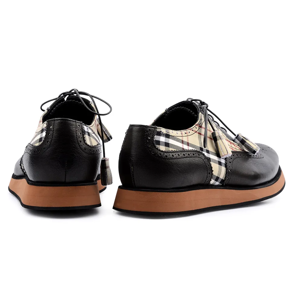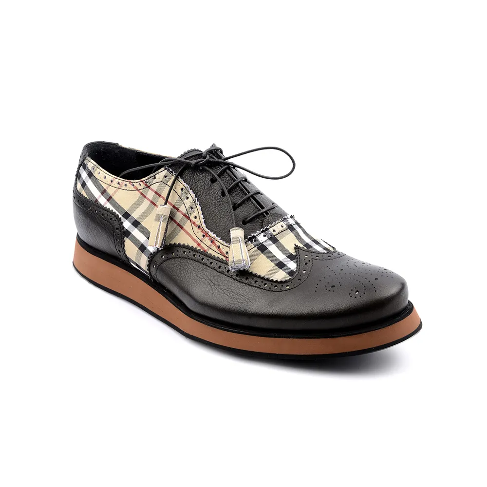 E’ una francesina in vitello e tessuto bicolore testa di moro fantasia scozzese con nappine alle estremità dei lacci ( 5 fori )
