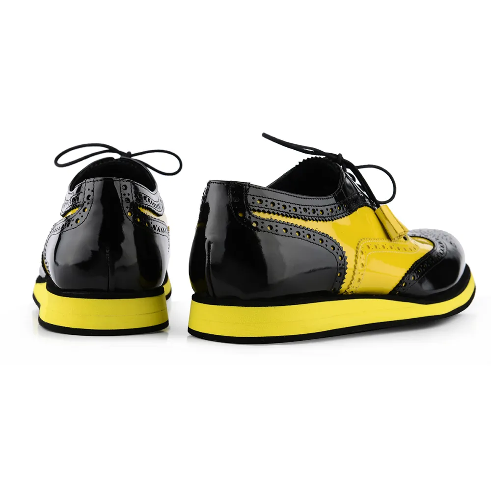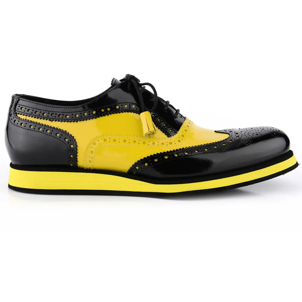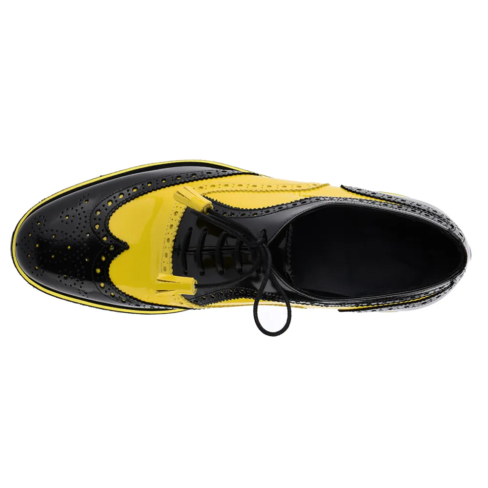 E’ una francesina in vitello bicolore abrasivato spazzolato nero giallo con nappine alle estremità dei lacci ( 5 fori )