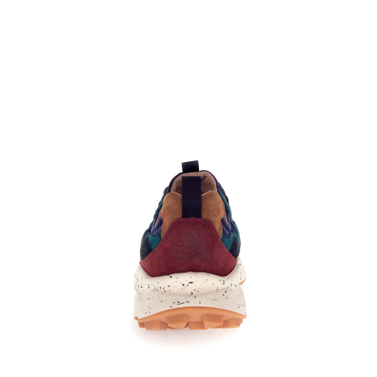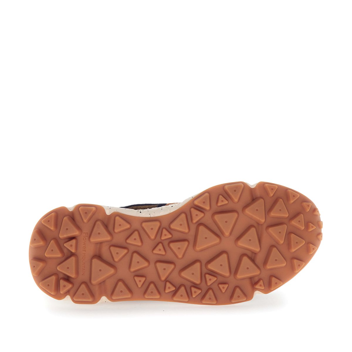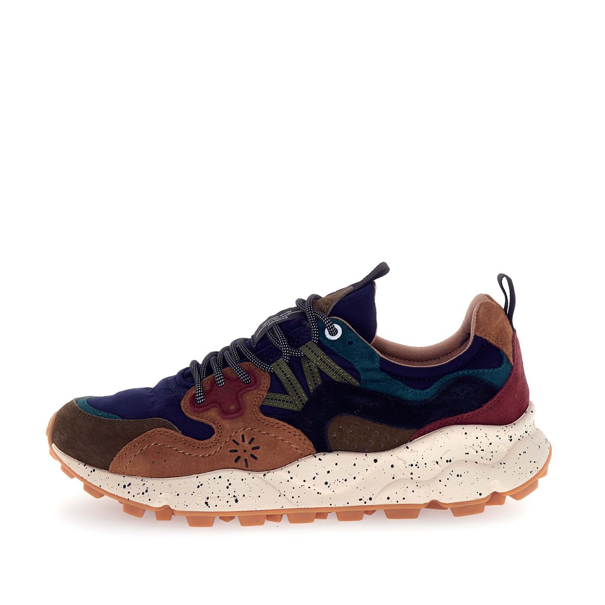 Sneaker Flower Mountain modello Yamano 3. Sportiva dal look metropolitano in suede verde e bruciato e tessuto tecnico blu. Riporti in suede nero e petrolio. Soletta interna in sughero anatomica e antibatterica. Suola in gomma dentata per un grip ottimale. Calzata regolare.