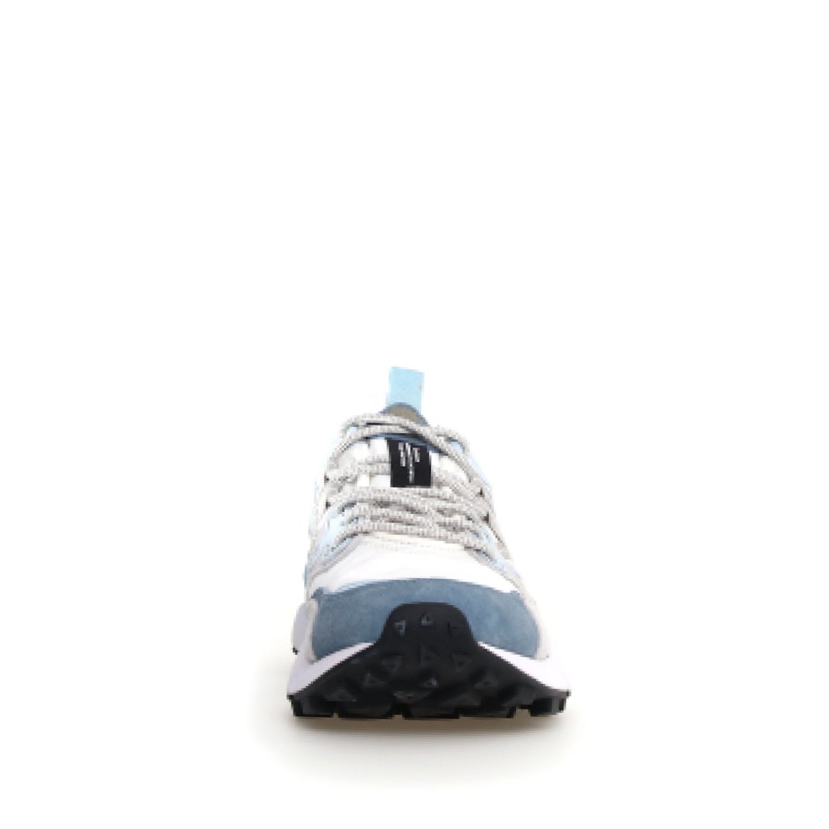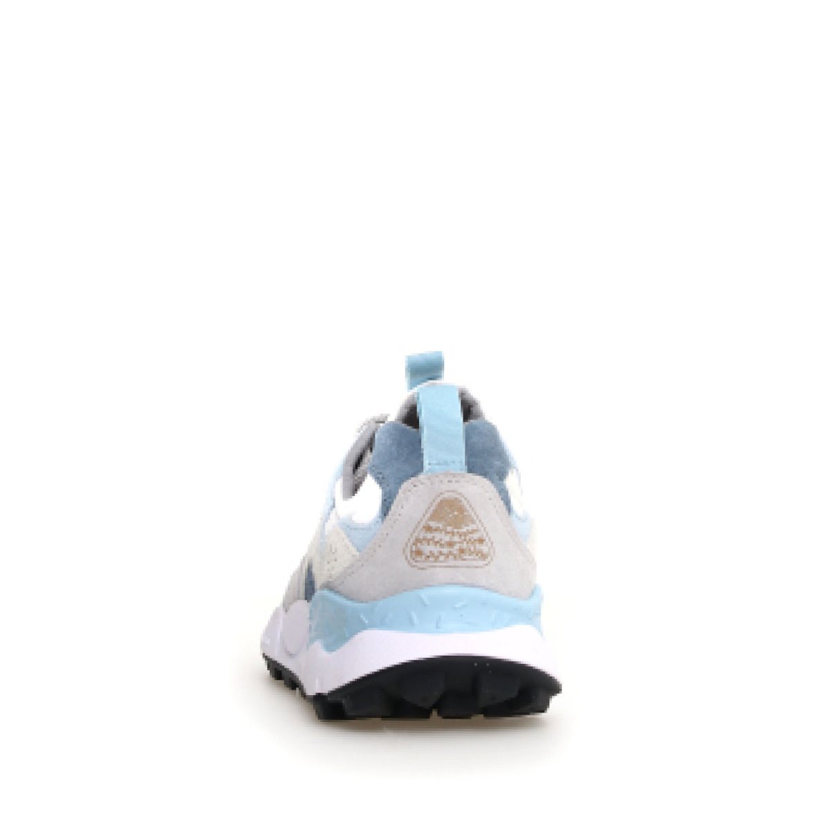 Sneaker Flower Mountain modello Yamano. Urbana dall’aspetto sport chic in suede grigio e inserti azzurri e tessuto tecnico bianco. Suola dentata per un grip ottimale per un’altezza complessiva di cm 4. Sottopiede in sughero rigenerato per una calzata ultracomfort.