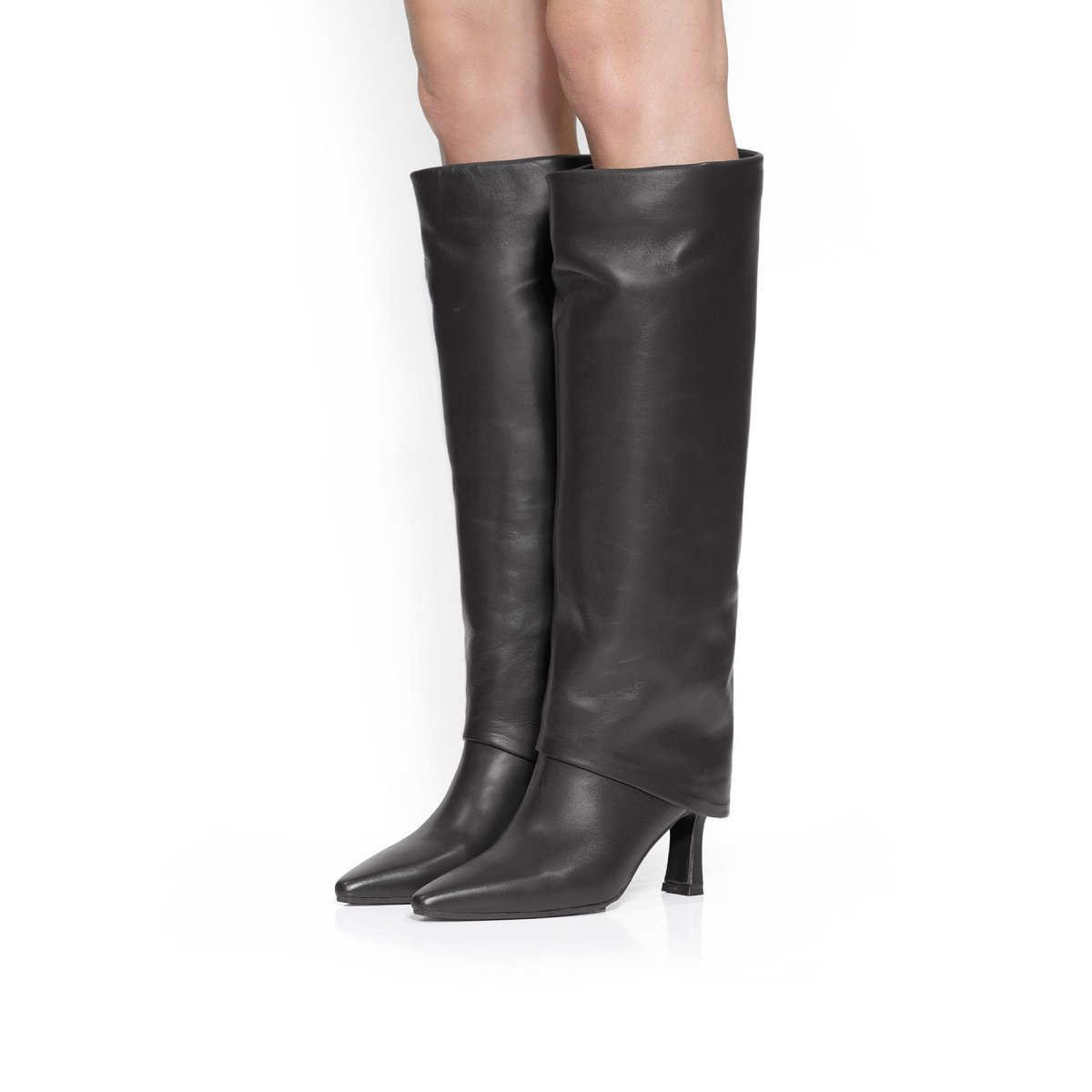 Stivale in morbida pelle nappa vitello nero con risvolto in pelle. elegante e deciso, con tacco 8 cm, unisce stile, femminilità e qualità artigianale silk-ò.