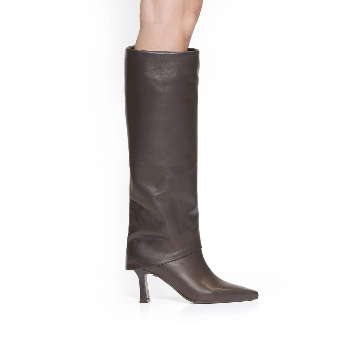 Lo stivale in pelle nappa color testa di moro con risvolto in nappa silk-ò è un simbolo di eleganza sofisticata e personalità decisa. realizzato in vera pelle nappa di alta qualità, si distingue per la sua texture morbida e lussuosa, che avvolge la gamba con una vestibilità confortevole e raffinata.