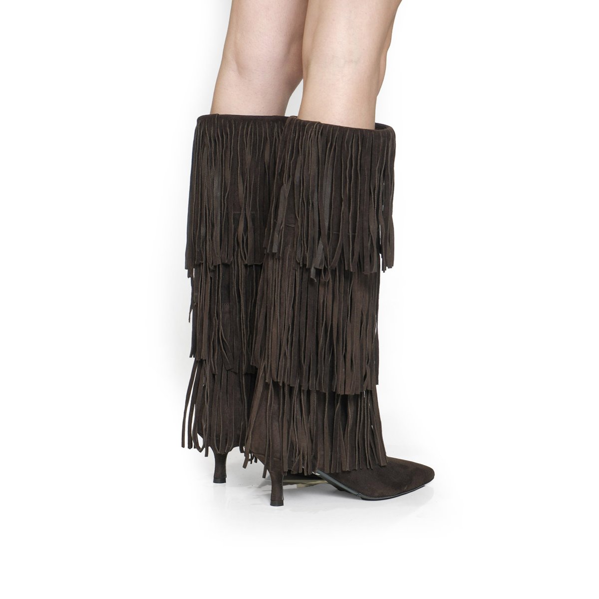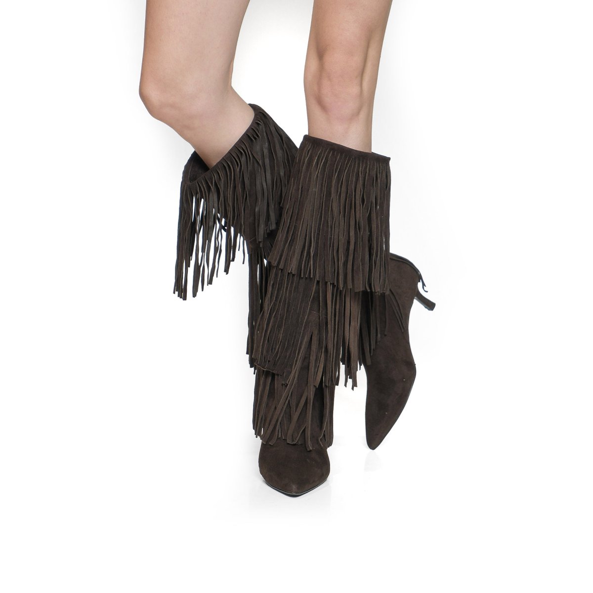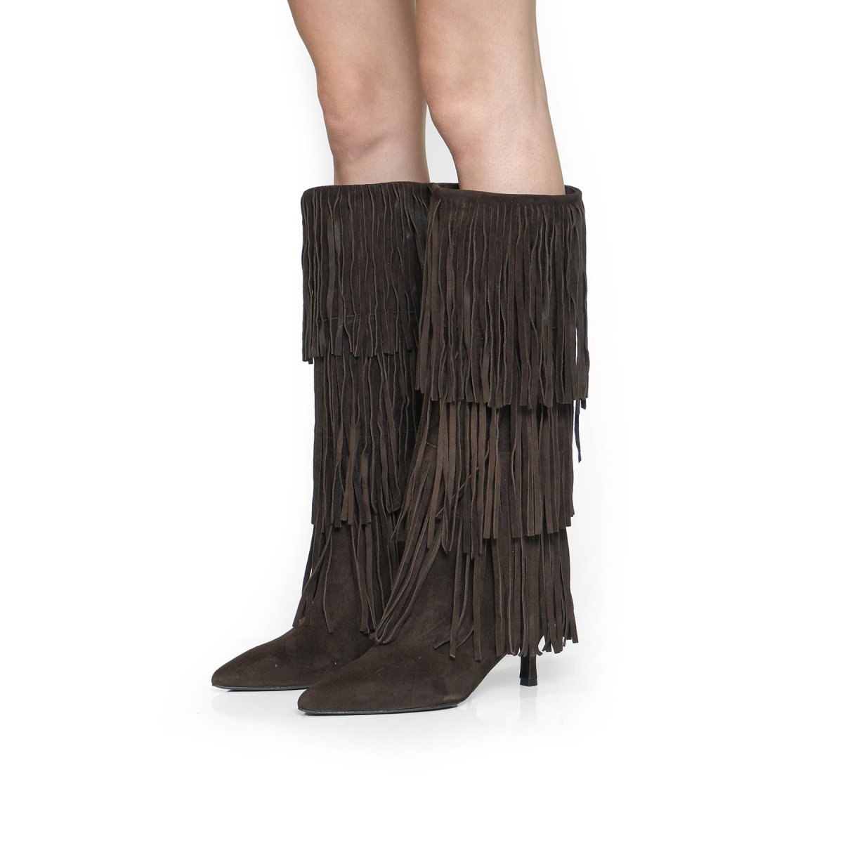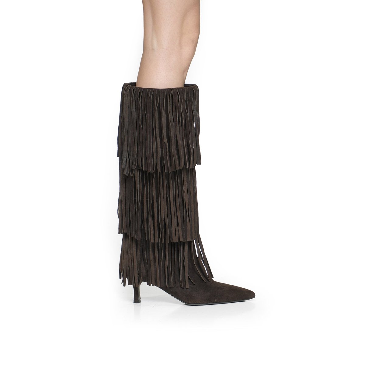 Stivale in pelle camoscio t. moro con tre balze di frange e tacco 8 cm . grintoso , fashion e irresistibilmente boho, è perfetto per look decisi e pieni di personalità. fodera e sottopiede in pelle , zip interna , firmato silk-ò , per chi ama farsi notare con stile.