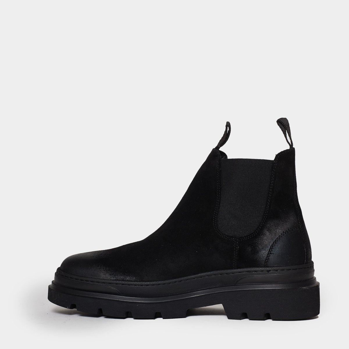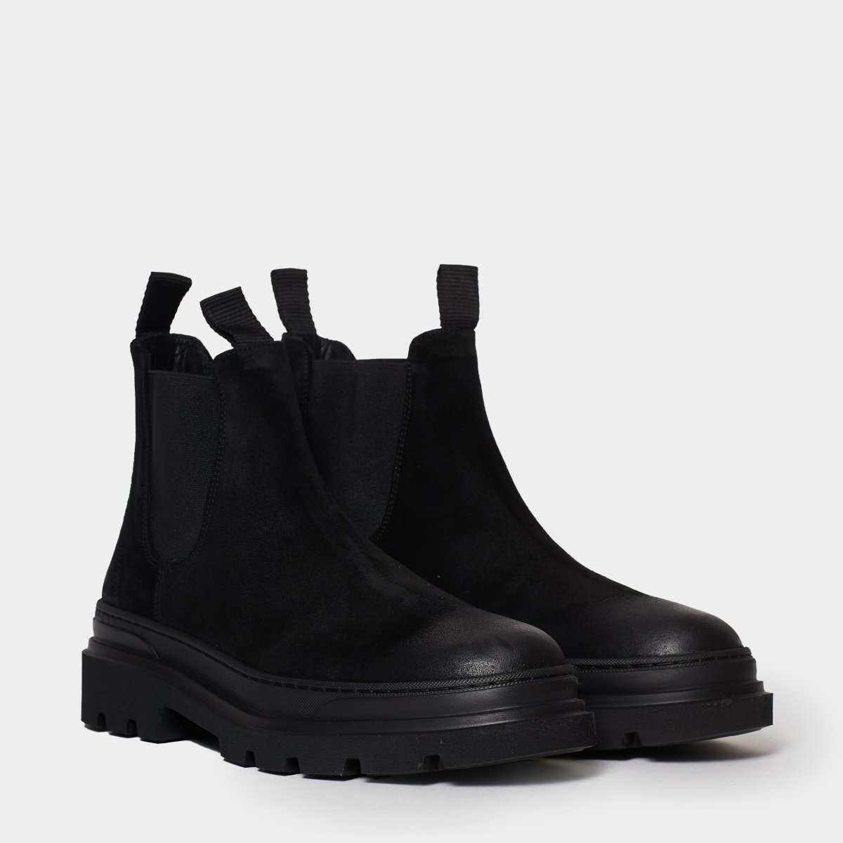 Stivaletto chelsea con elastici laterali, realizzato in suede ingrassata nero. Suola in gomma montante per un look urbano contemporaneo. Calzata regolare.