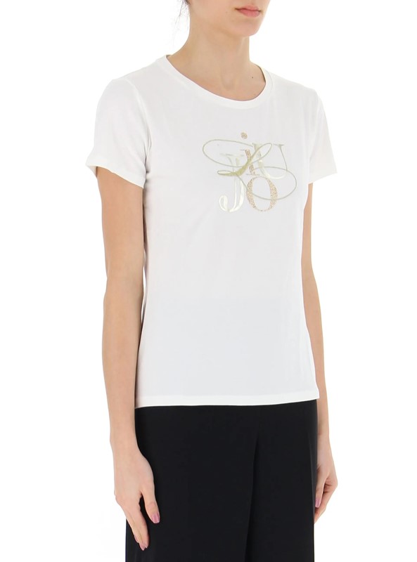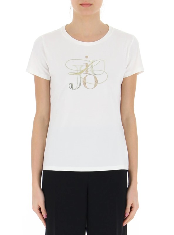 Nuovi arrivi LIU JO TA4136 JS003 T-shirt con logo ricamato e stampato sul davanti in oro, con dettagli glitter. Perfetta per dare luce ai tuoi outfit. Composizione: 95% cotone, 5% elastene.