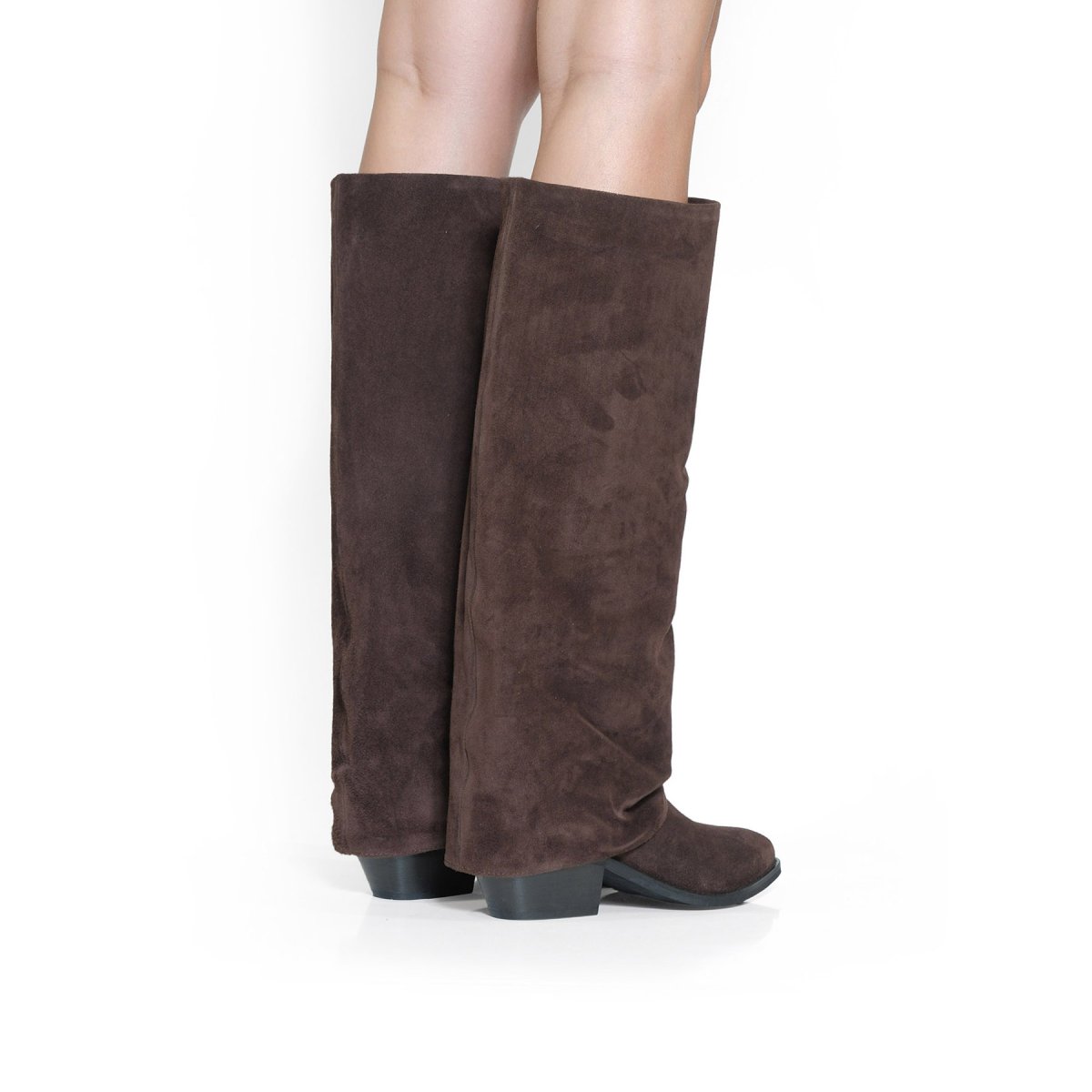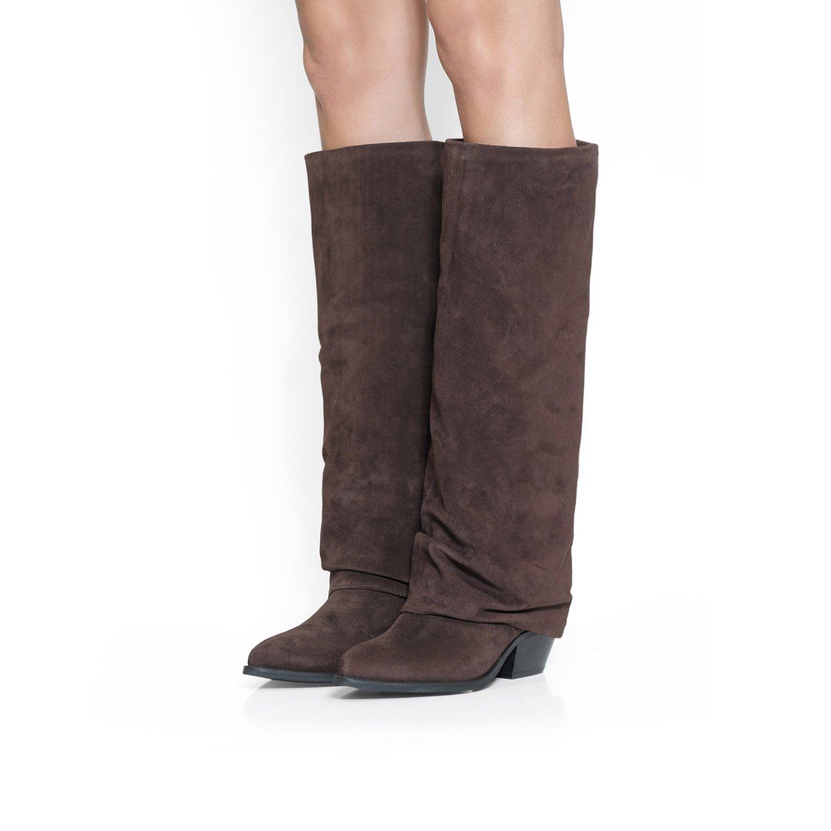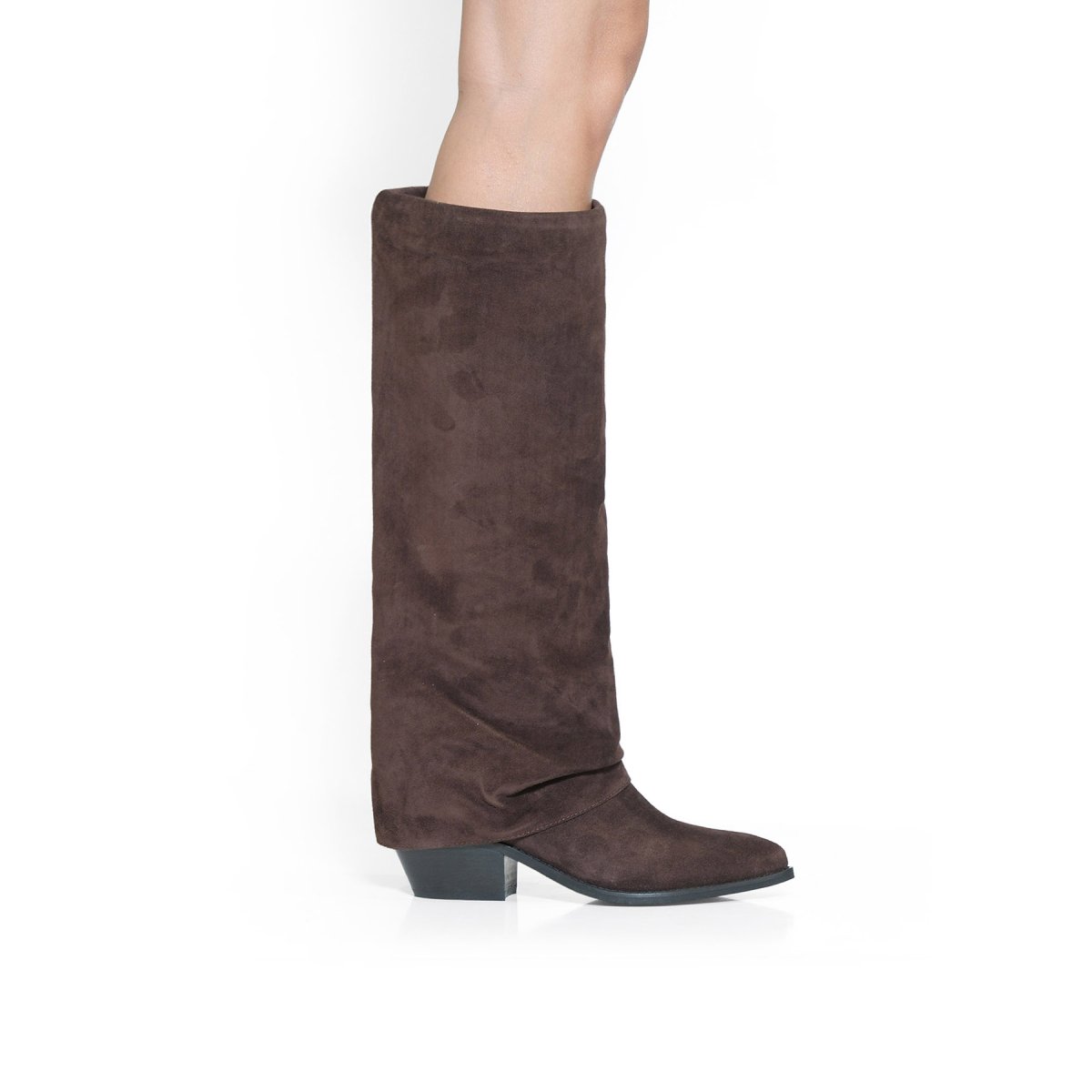 Stivale texano silk-ò in pelle scamosciata testa di moro, con risvolto, fodera e sottopiede in pelle. fondo in gomma, tacco 5 cm: comodo, raffinato e perfetto per ogni giorno.