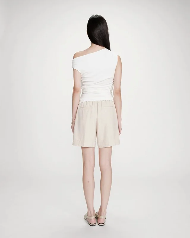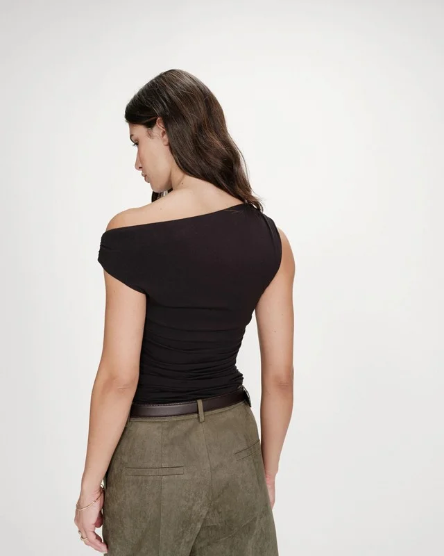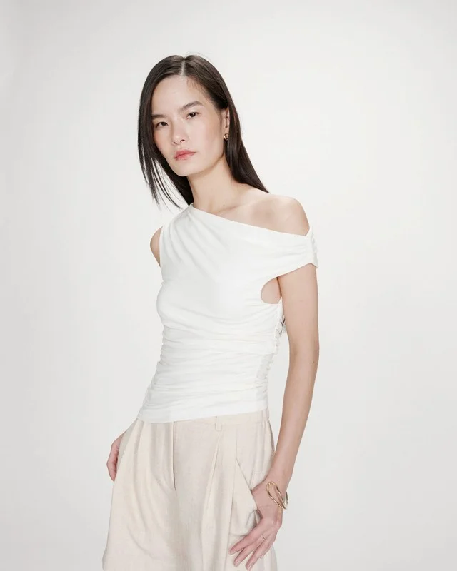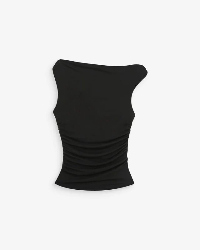 NUOVI ARRIVI GRACE AND MILA TOP ASIMMETRICO ARRICCIATO VODIA Top asimmetrico elasticizzato con arricciatura in vita, disponibile in due varianti colore.