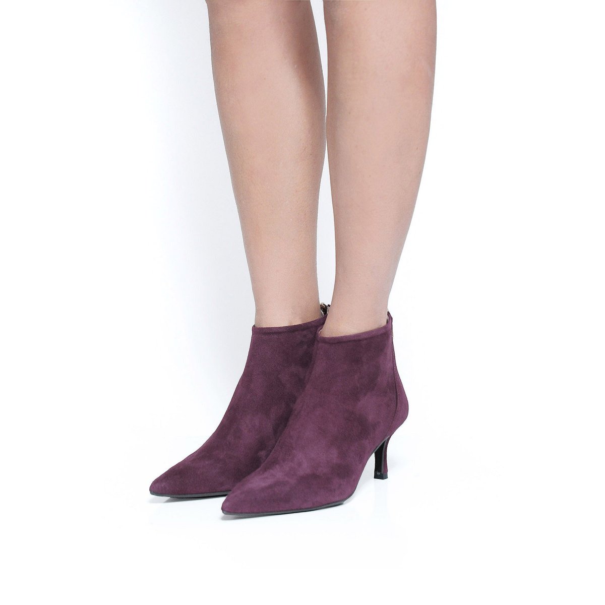 Tronchetto in camoscio color vino con tacco 6 cm e chiusura posteriore. elegante e confortevole, perfetto per look femminili e raffinati.