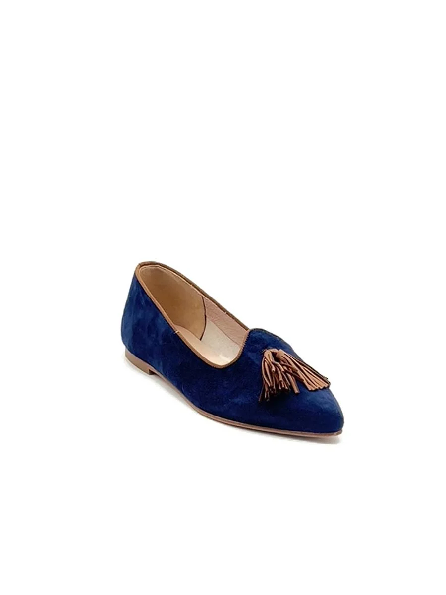 Si chiama “Violante” il nuovo mocassino di questa stagione. Dalla forma a punta realizzato in camoscio blu navy, con profili e nappine a contrasto in camoscio cuoio. Tacco cm 1. Il fondo è in cuoio.