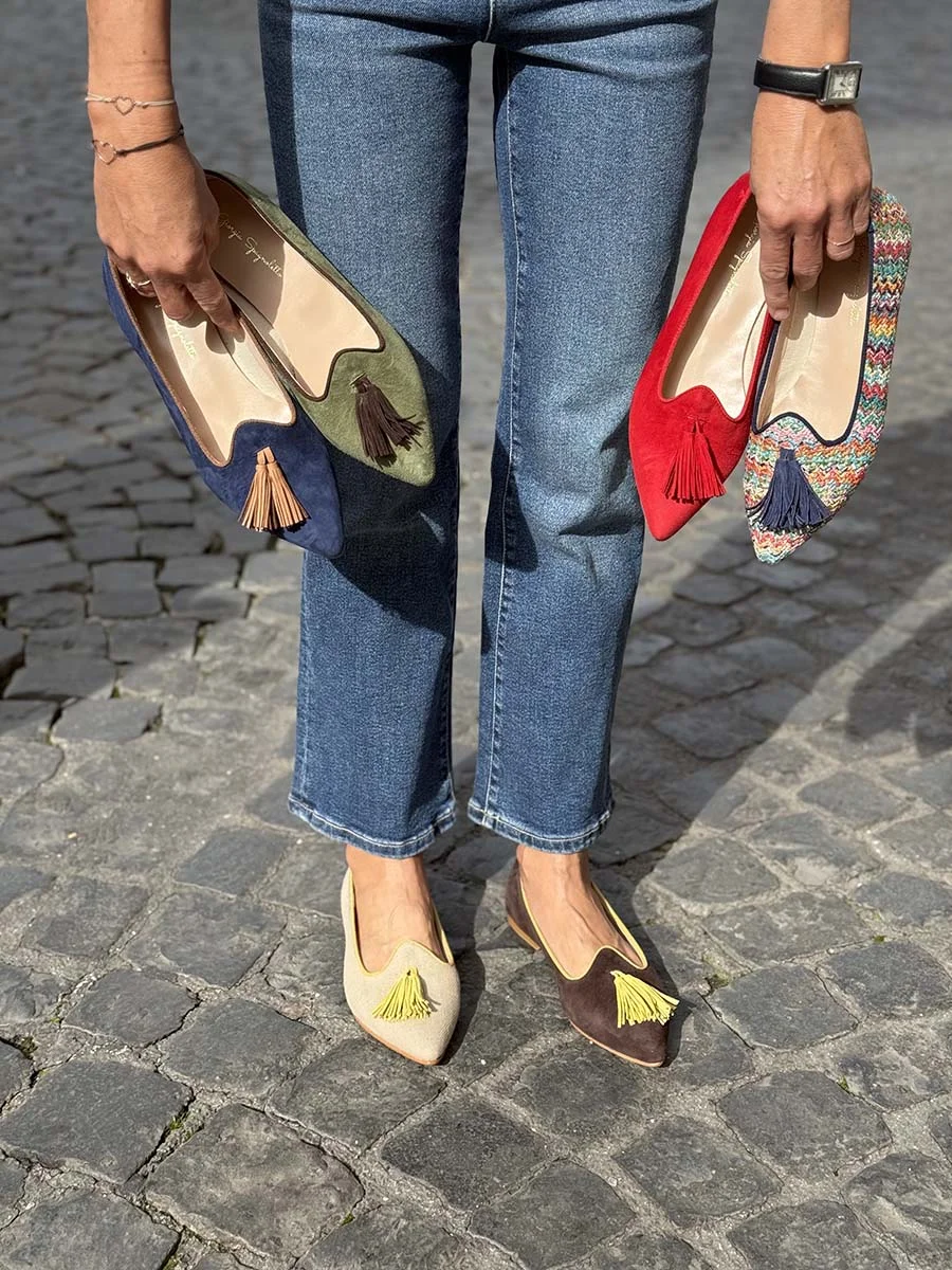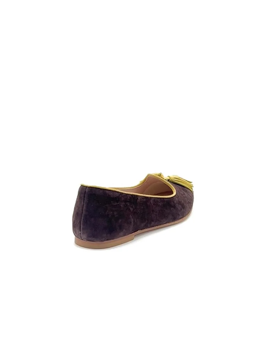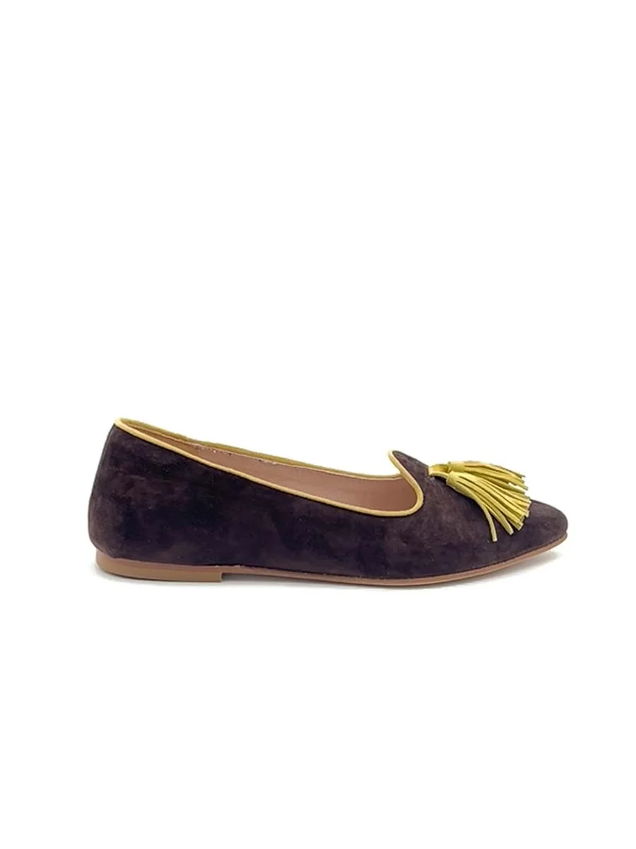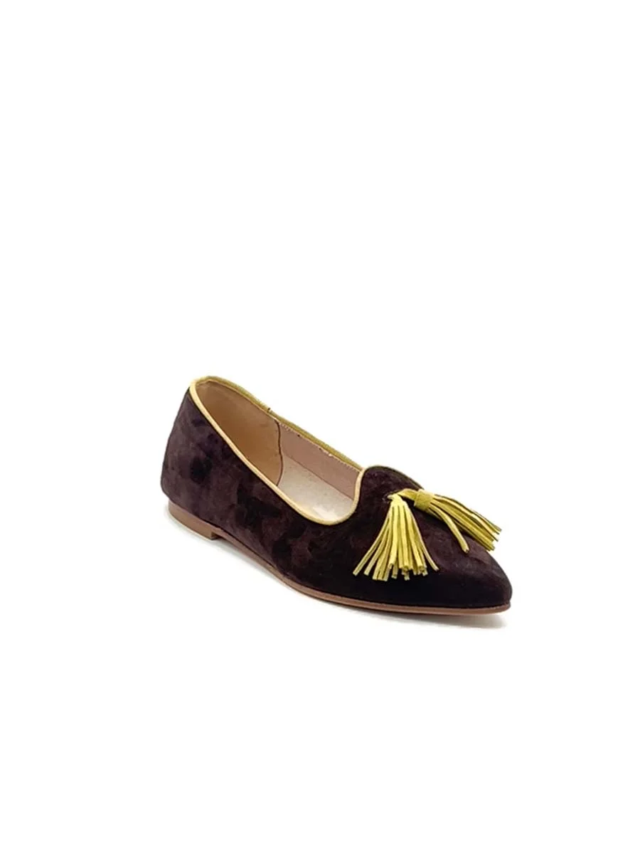 Si chiama “Violante” il nuovo mocassino di questa stagione. Dalla forma a punta realizzato in camoscio testa di moro, con profili e nappine a contrasto in camoscio giallo. Tacco cm 1. Il fondo è in cuoio.